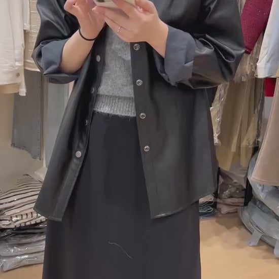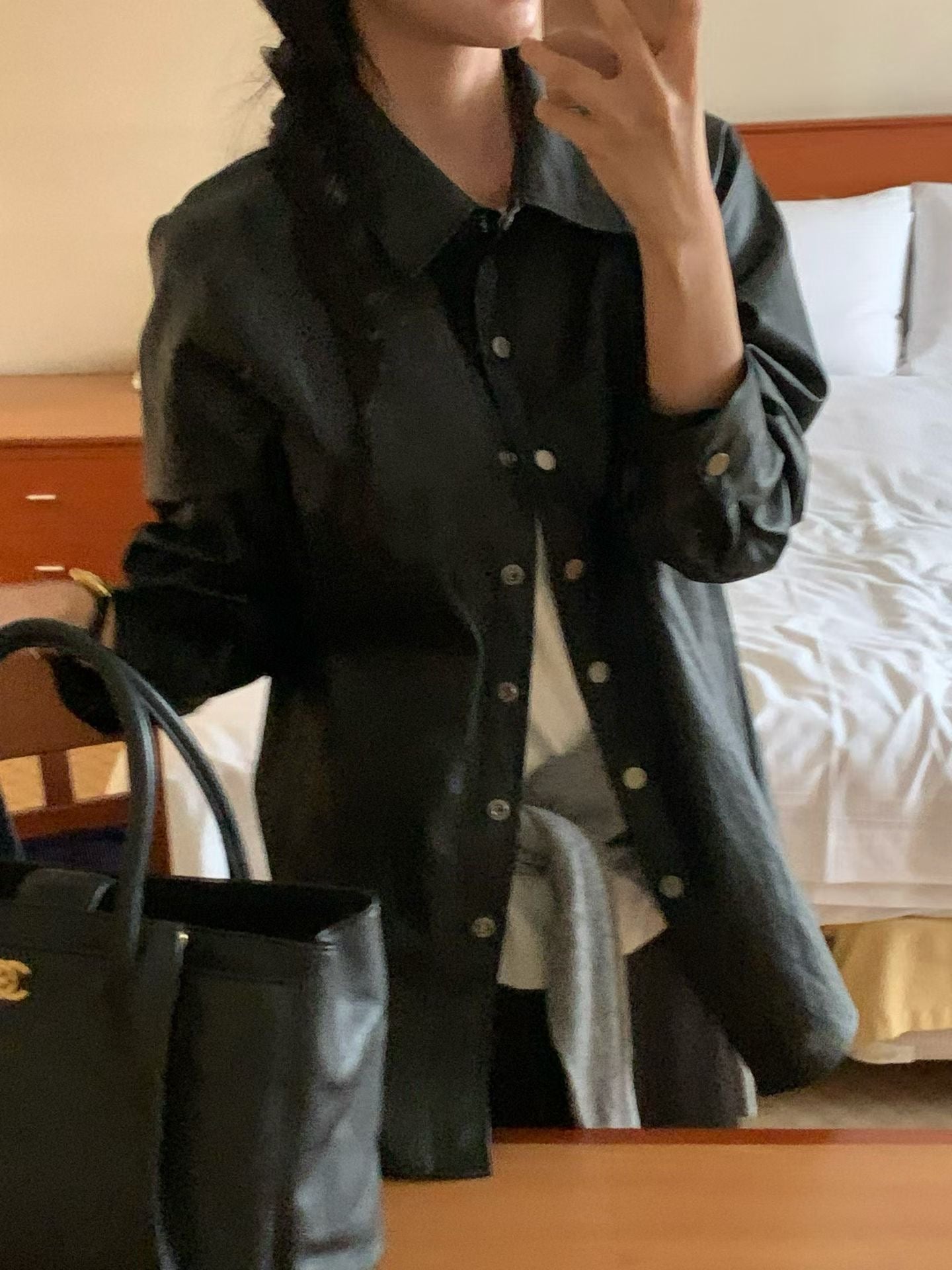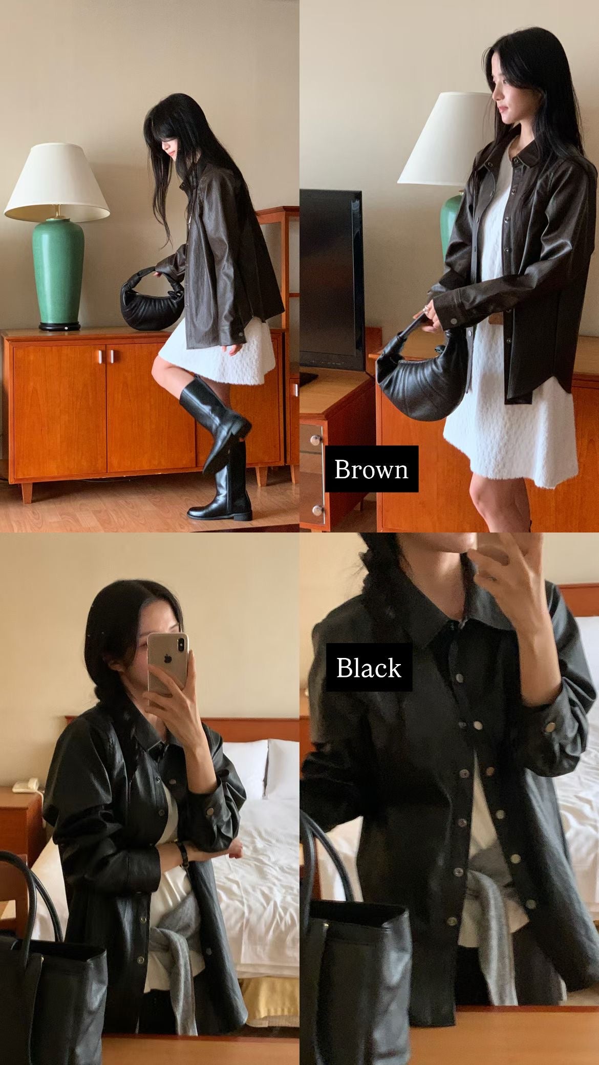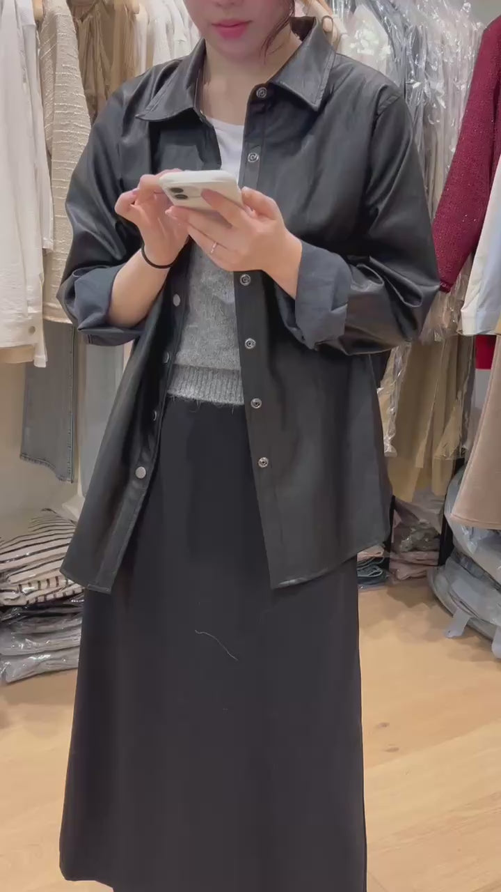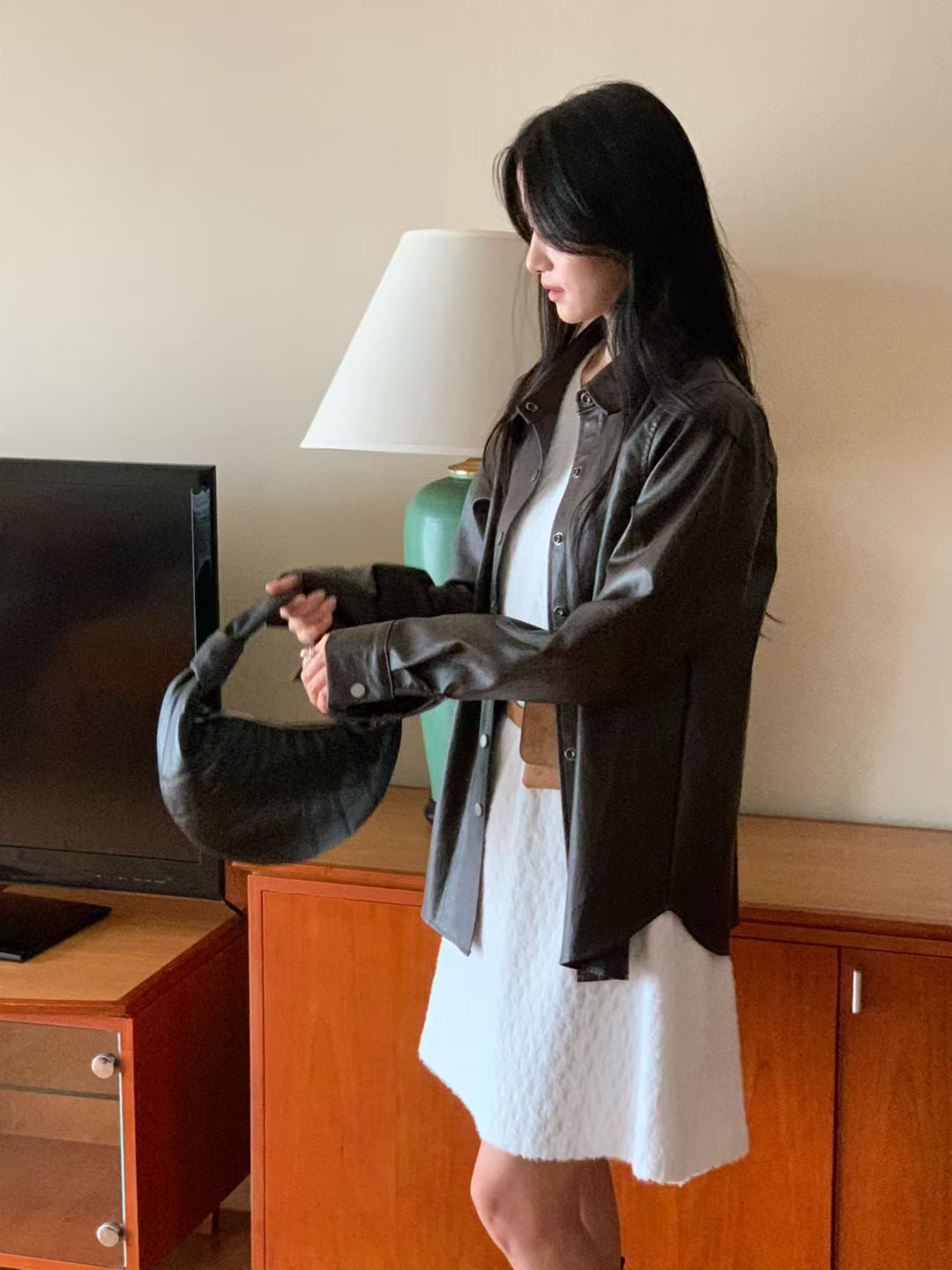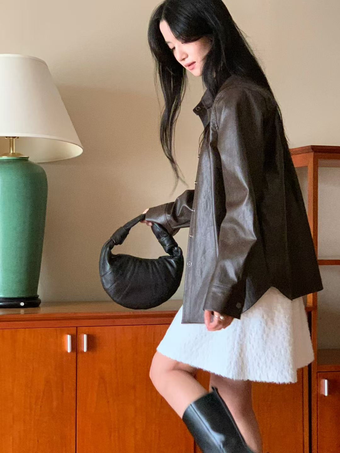 ⫸ 襯衫式設計:採用俐落的翻領與排釦設計,將皮革元素融入襯衫版型,剛柔並濟。