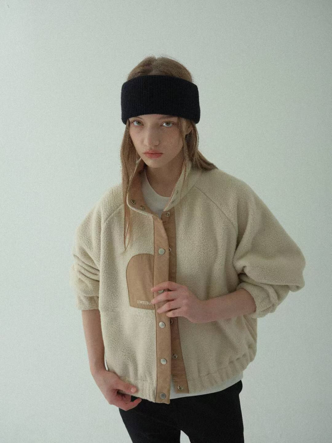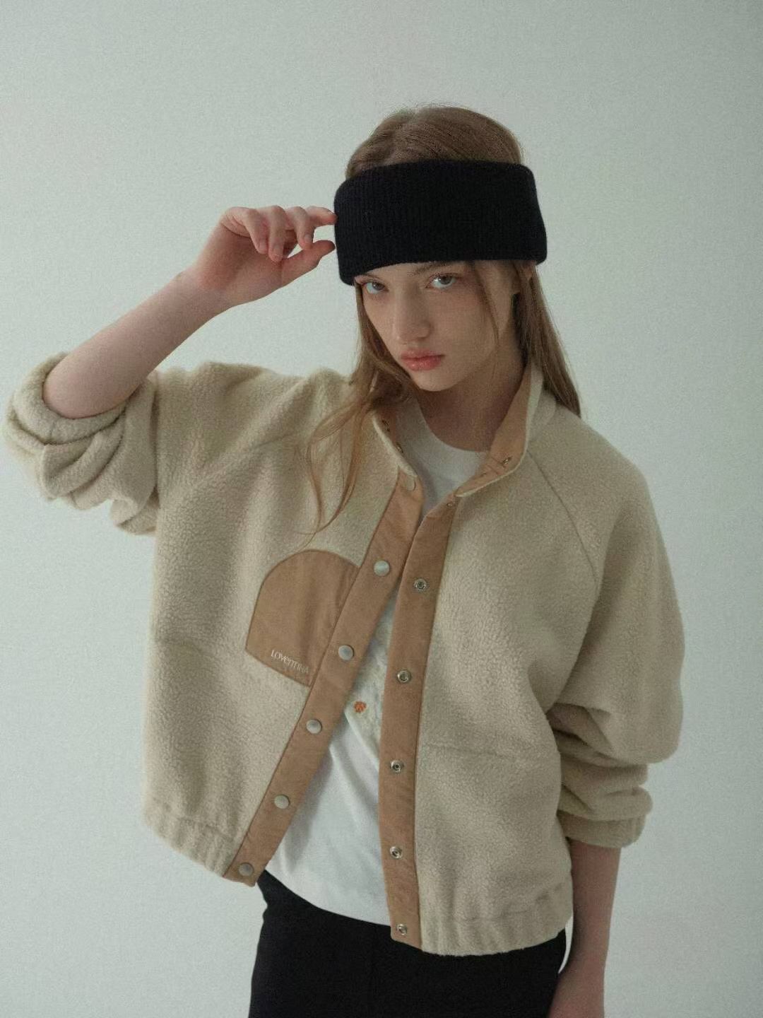 ⫸ 對比拼布:門襟、胸前「半月口袋裝飾片」採斜紋布拼接(米杏×焦糖、深灰×黑),層次與運動感同步加分。