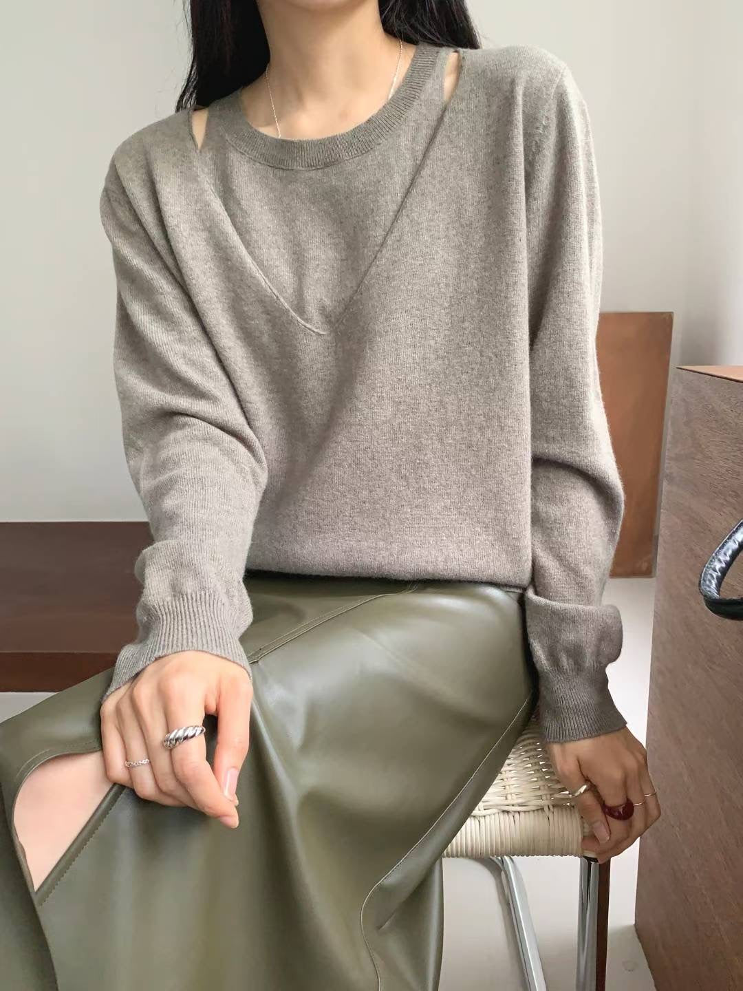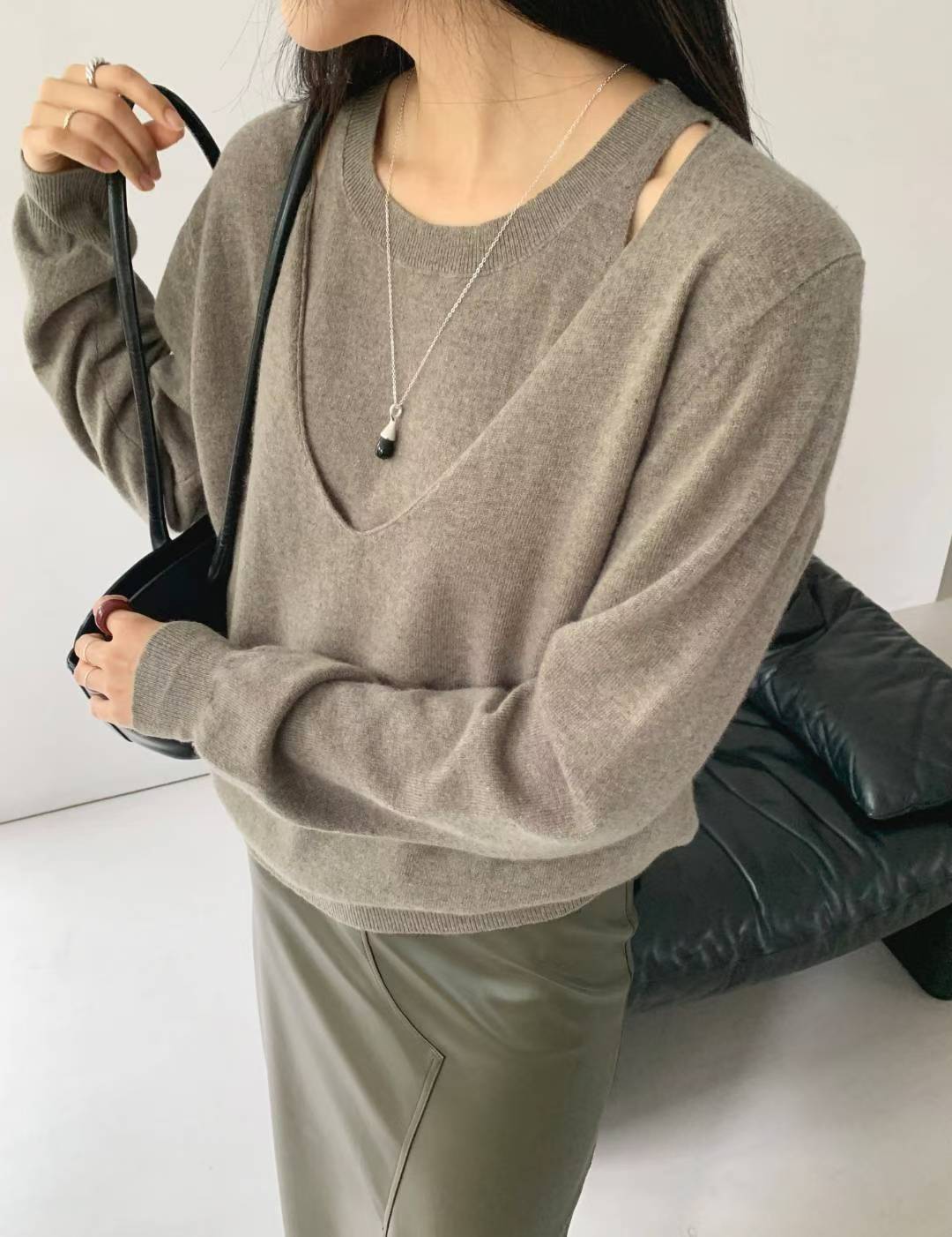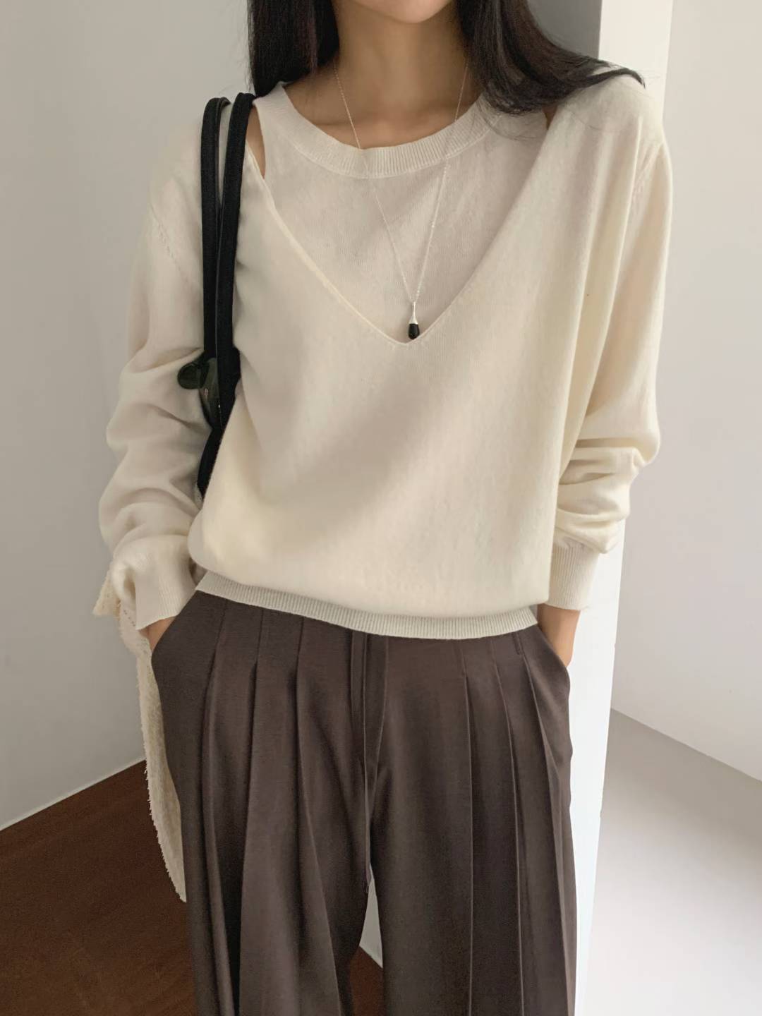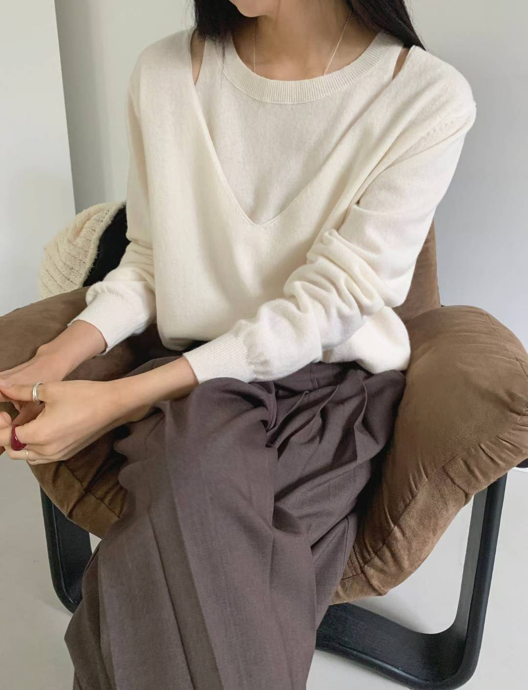 ⫸ 假兩件剪裁:結合圓領與深V設計,創造出層疊視覺,一件即有內搭效果。
