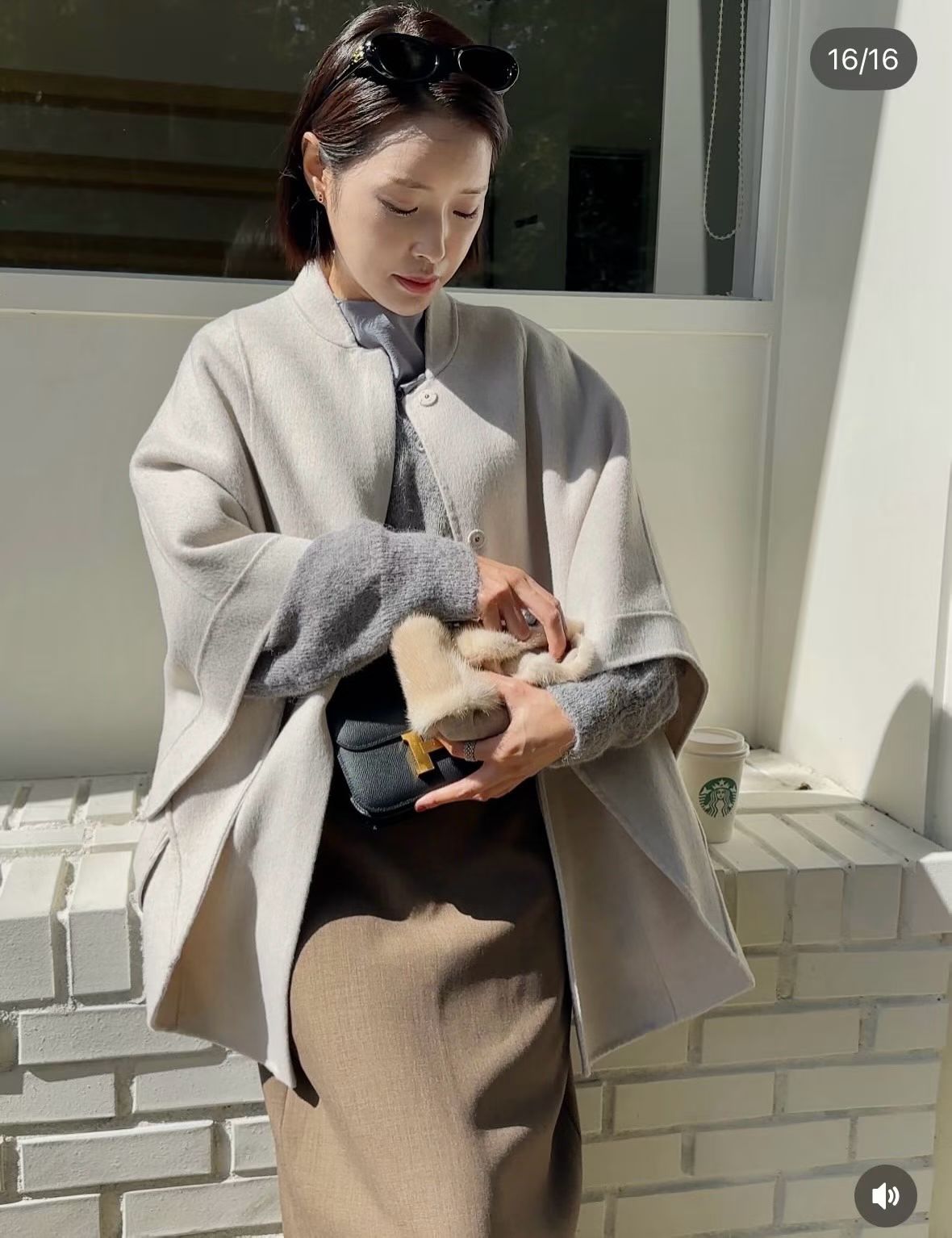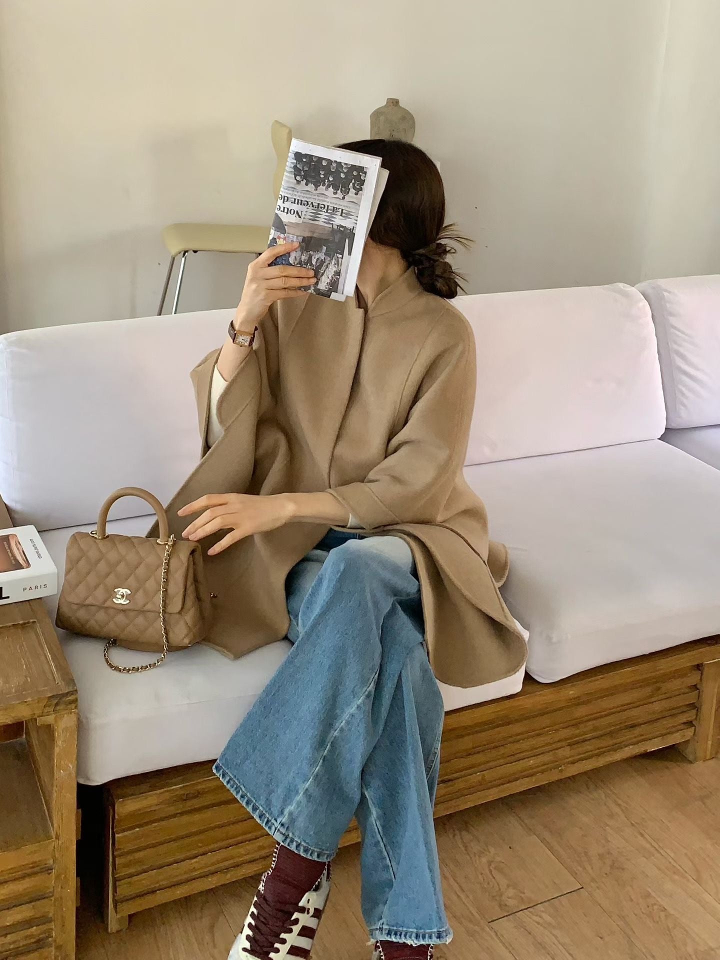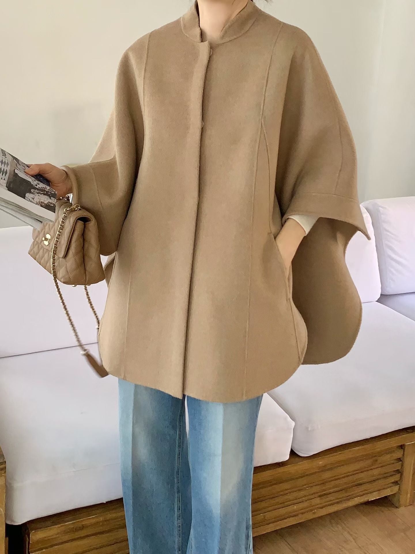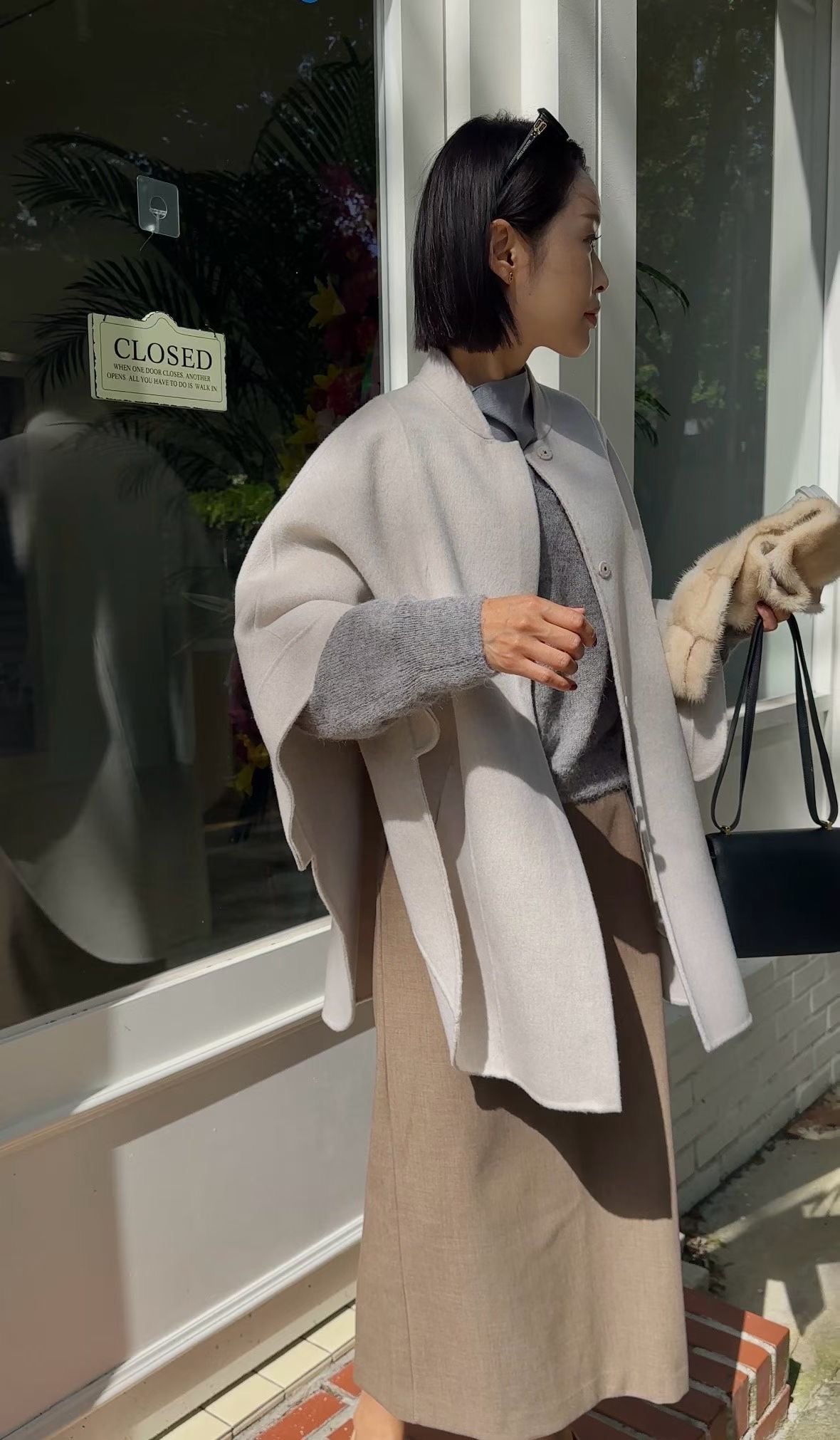 ⫸ 斗篷式輪廓:寬鬆披風剪裁遮蓋肩部與手臂,流動線條優雅,內搭厚毛衣也毫無壓迫感。