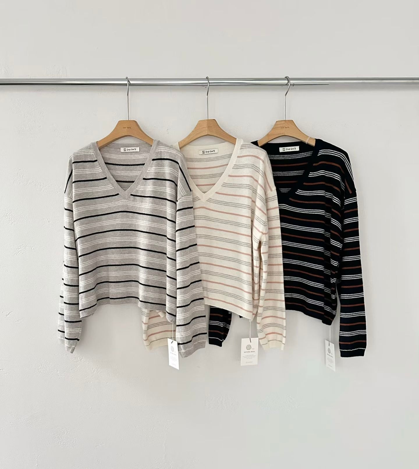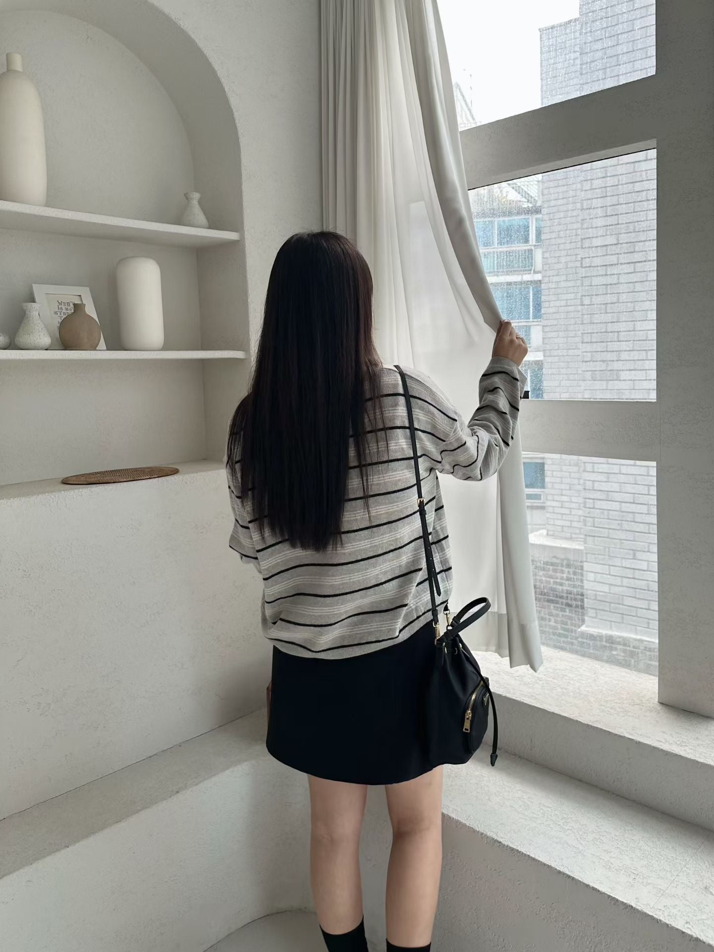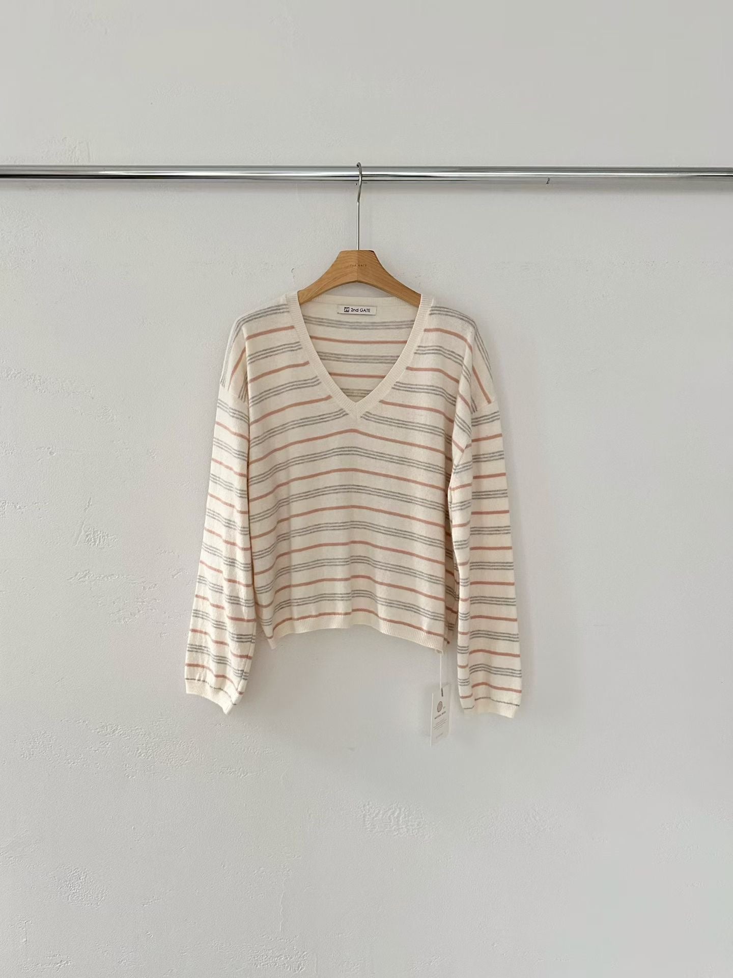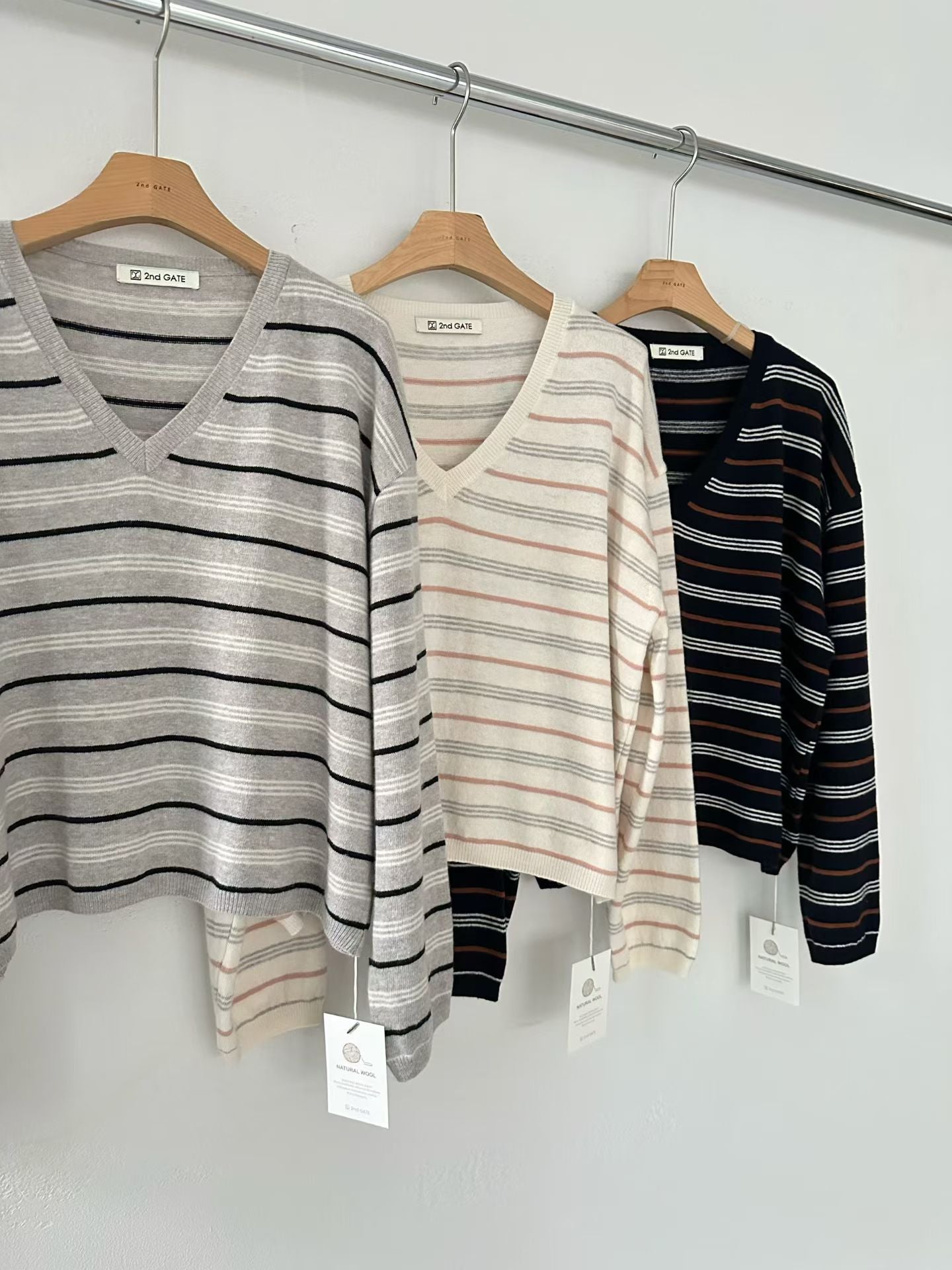 ♡文青感鬆身條紋V領上衣♡ (C251025)