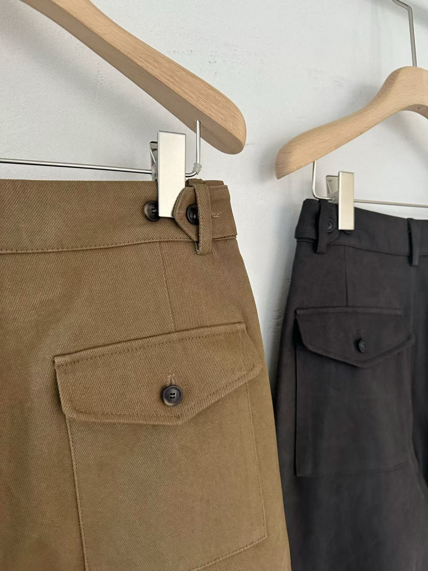 ⫸ 貼心口袋:前側斜口袋好收納;後片翻蓋釦口袋增添工裝感與層次。