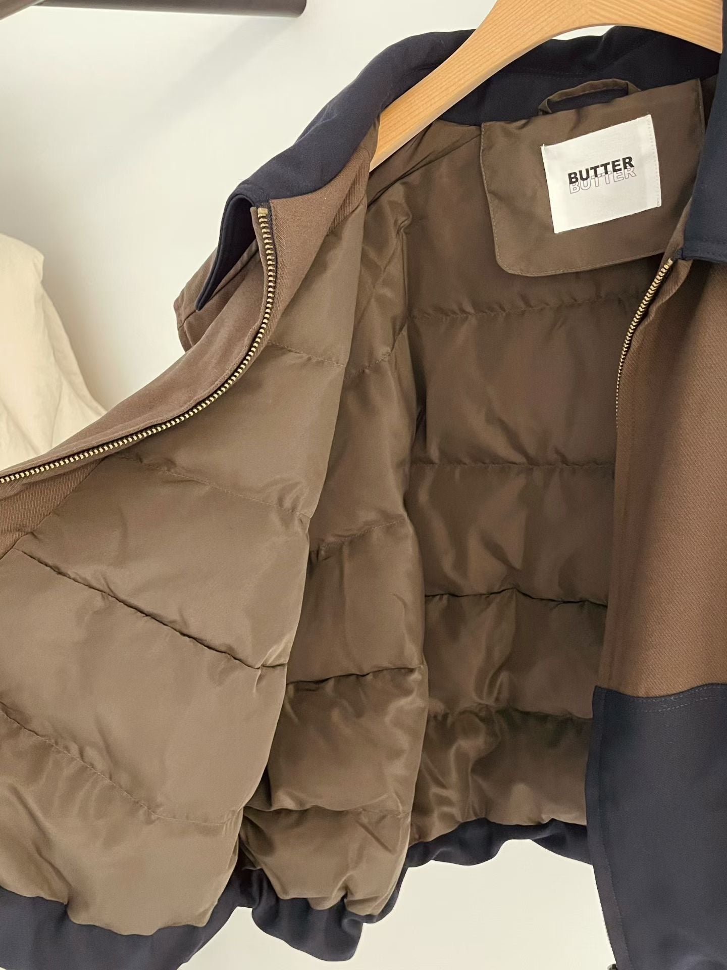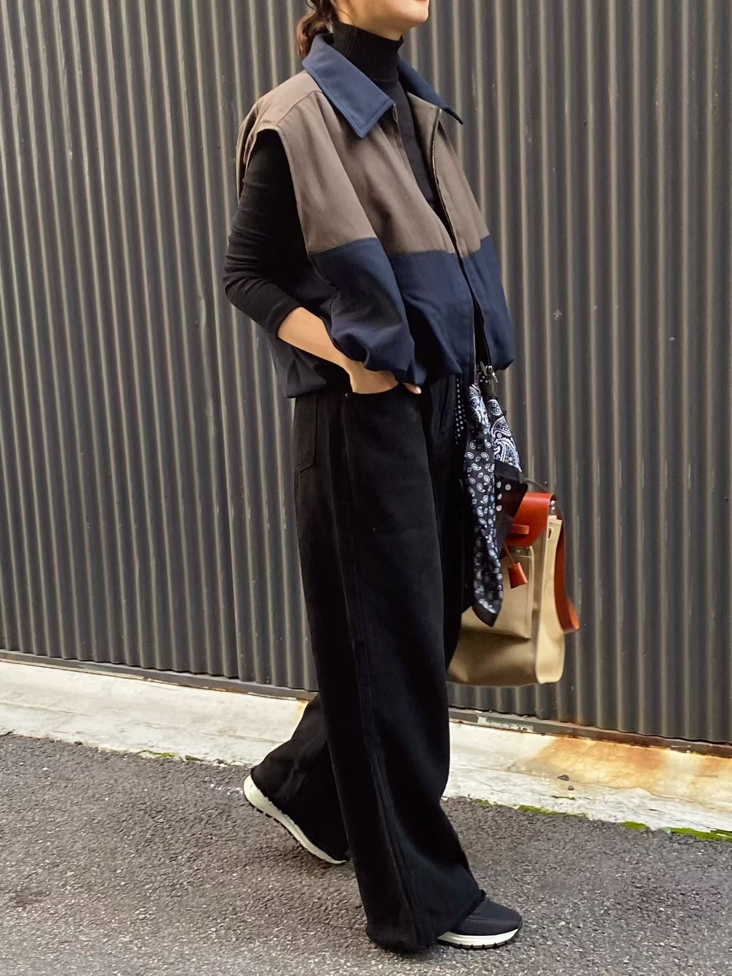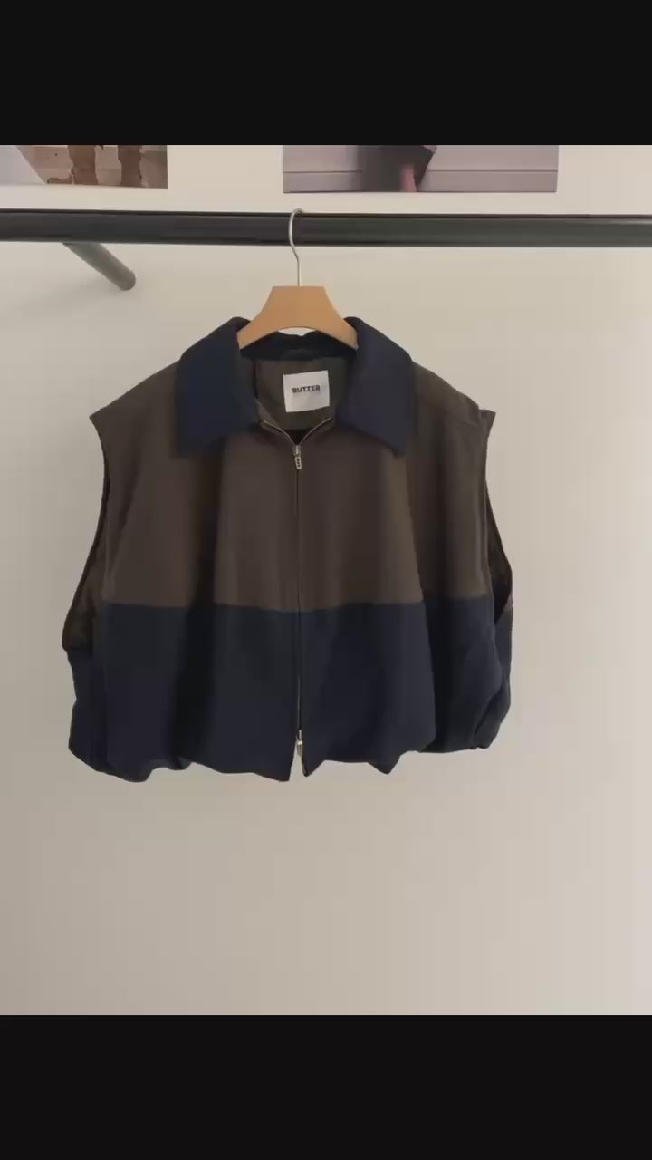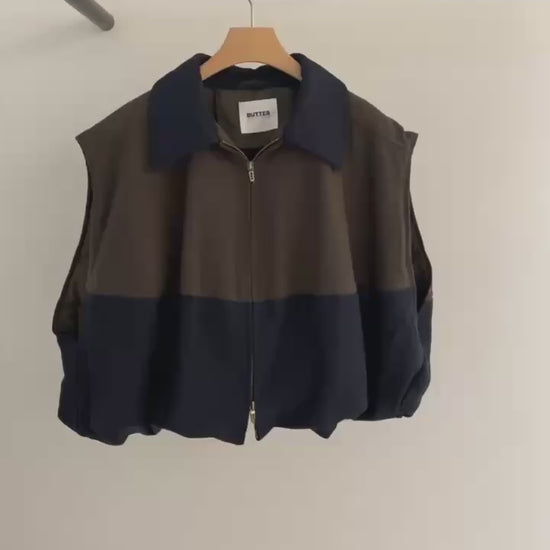 ⫸ 拼色外觀:暖棕與深海藍撞色拼接,令整件背心跳脫單調,視覺層次豐富又時尚。