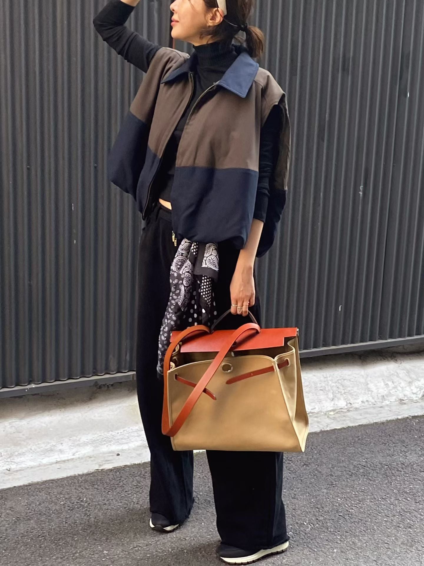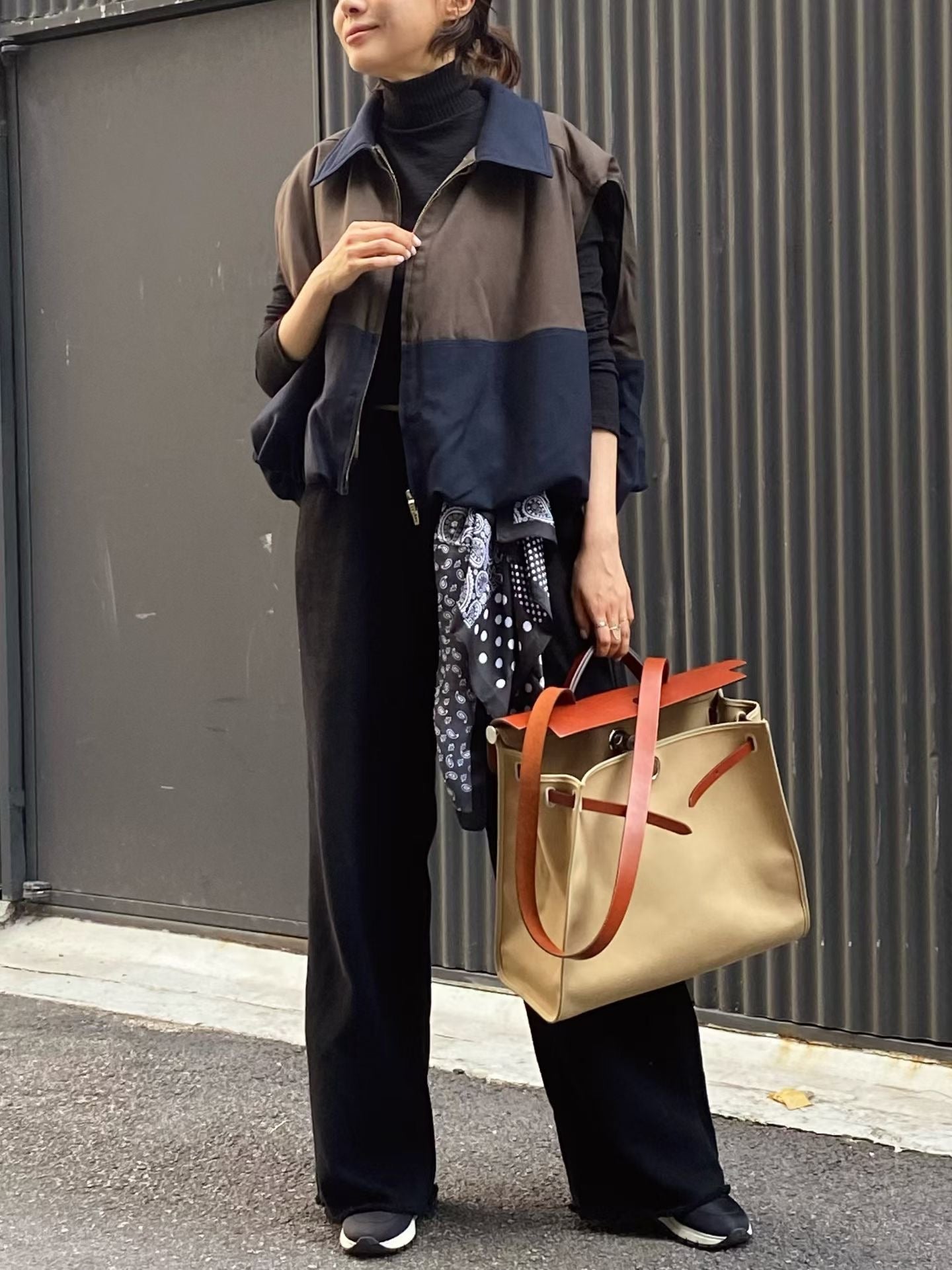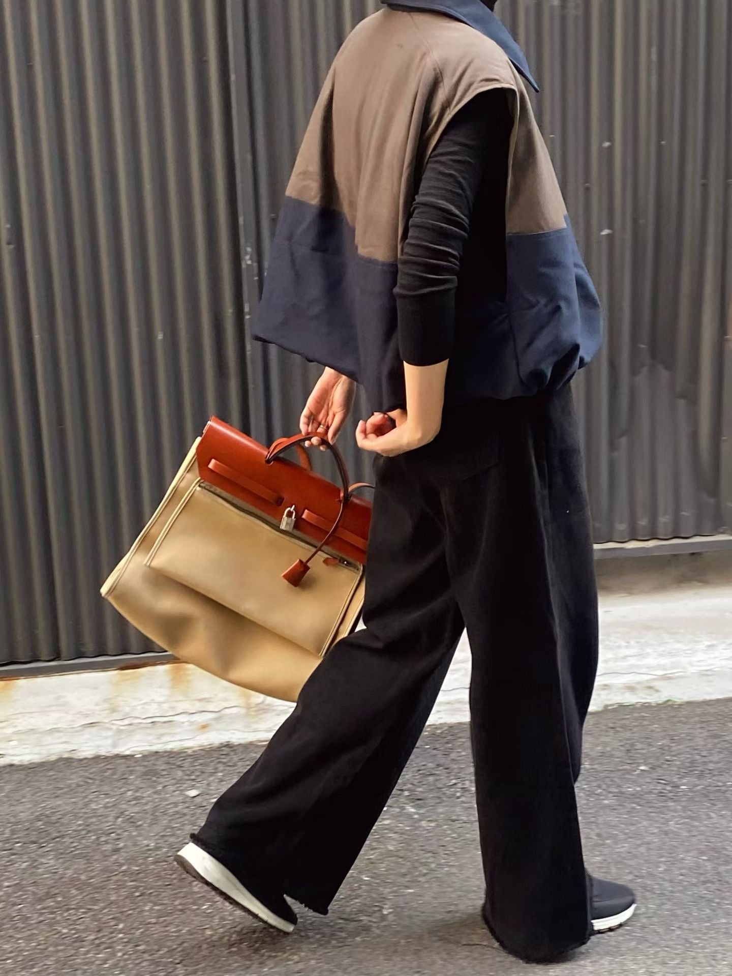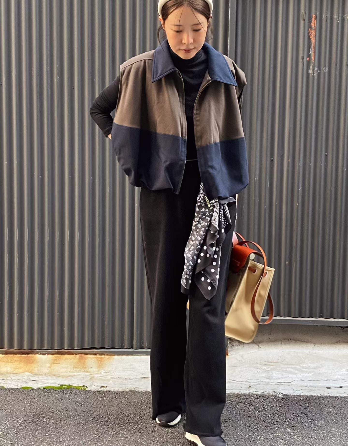 ⫸ 拼色外觀:暖棕與深海藍撞色拼接,令整件背心跳脫單調,視覺層次豐富又時尚。