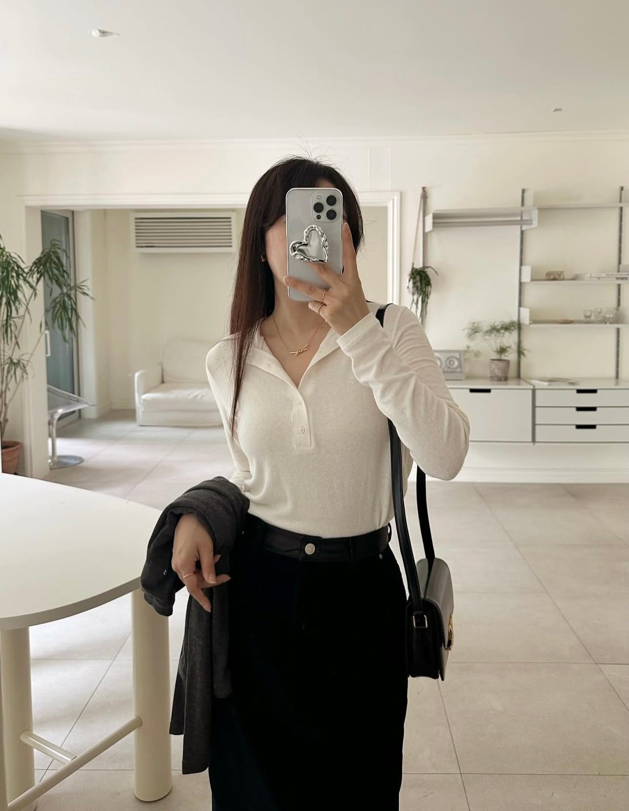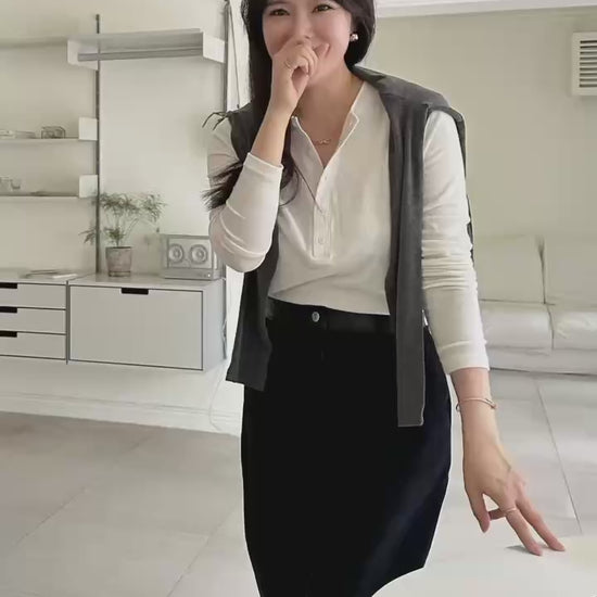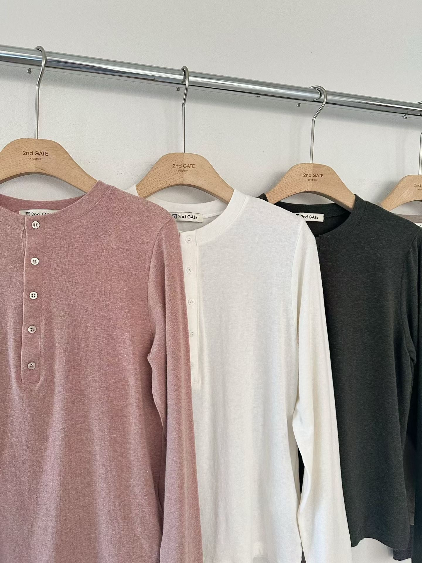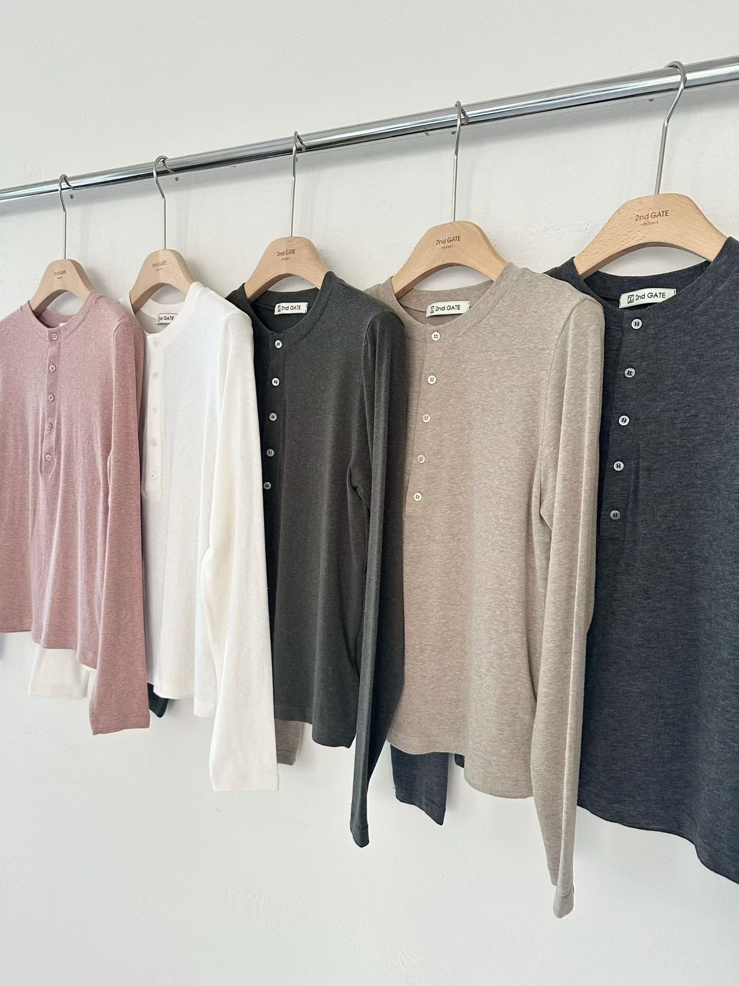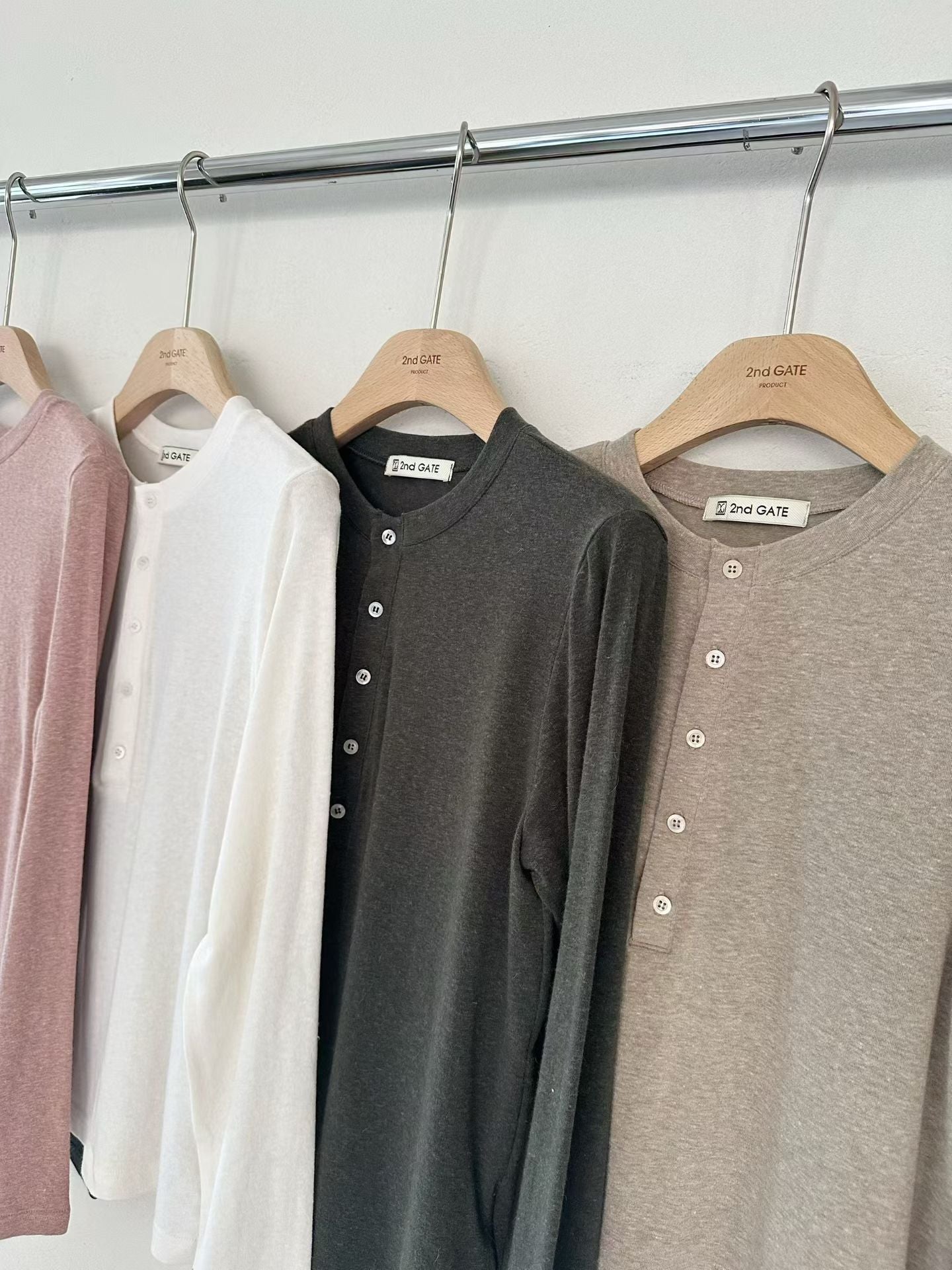 ⫸ 亨利領四釦門襟:可上可下調露鎖骨的開襟,優雅又有層次;單穿不單調、內搭不搶戲,兩件/兩色疊穿營造層次撞色感。