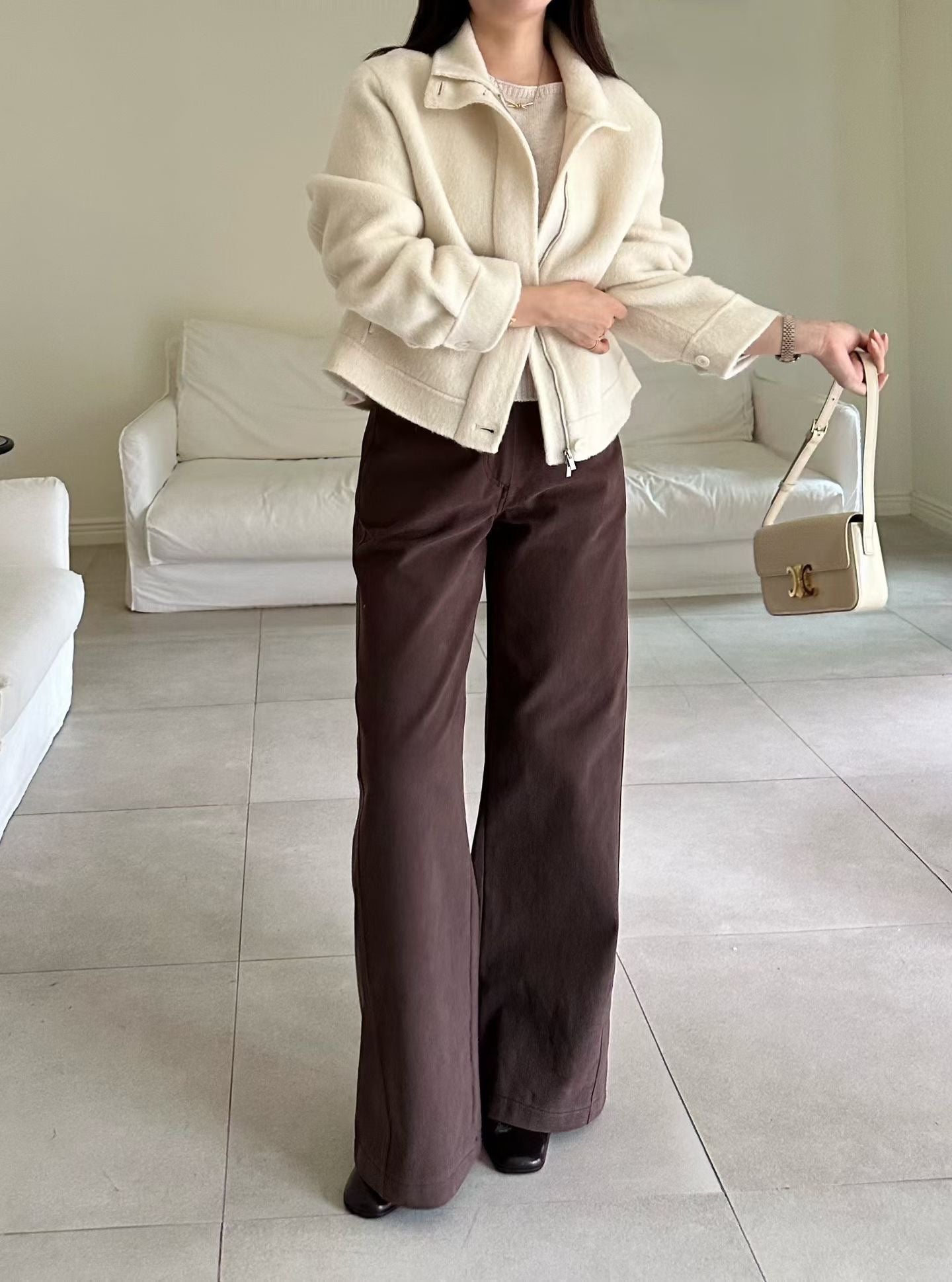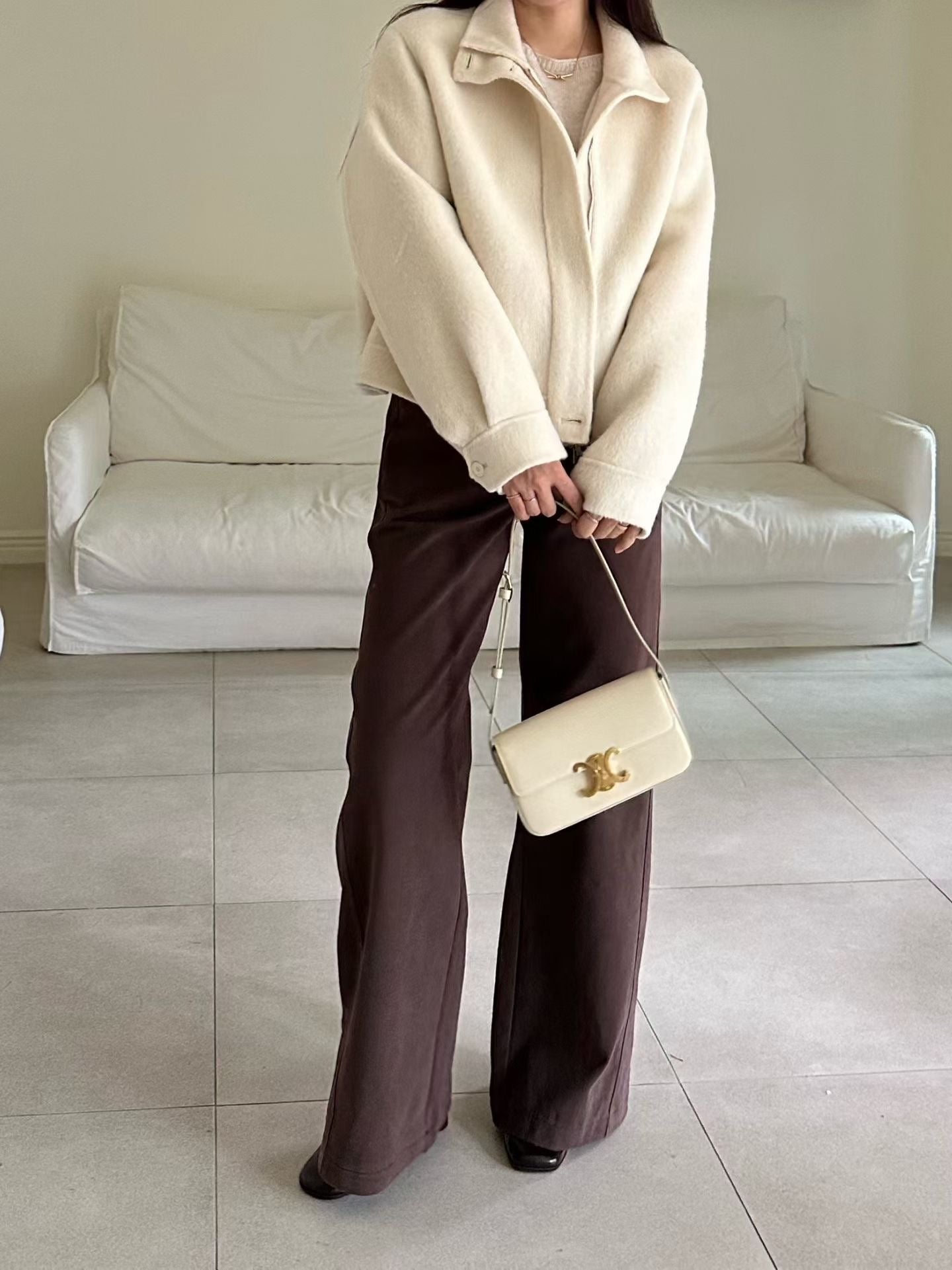 ⫸ 短版寬鬆直筒:落在骨盆上緣,拉長下半身比例;外罩針織也不臃腫。
