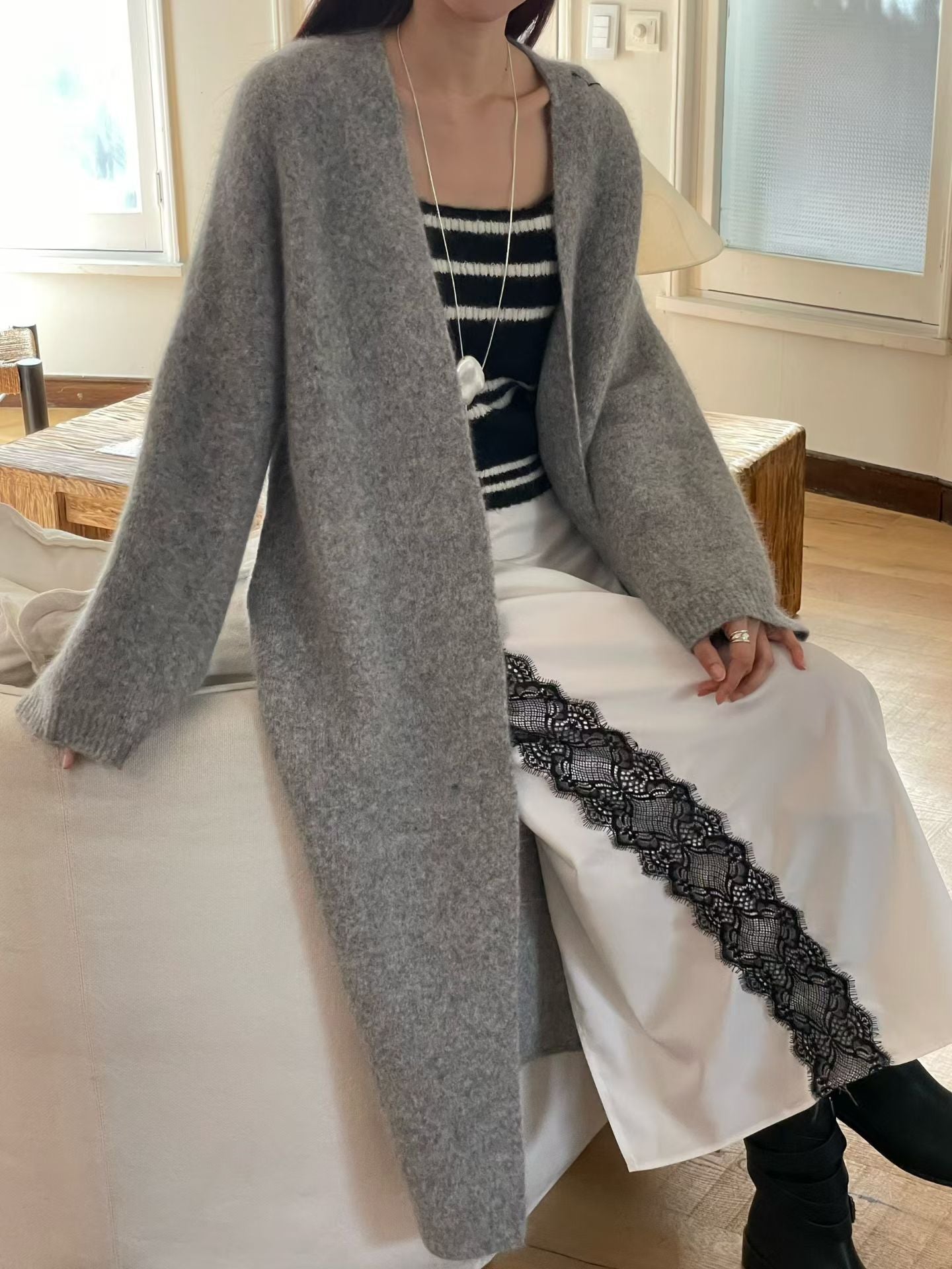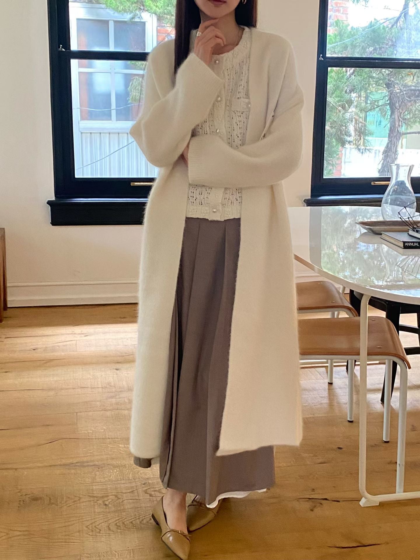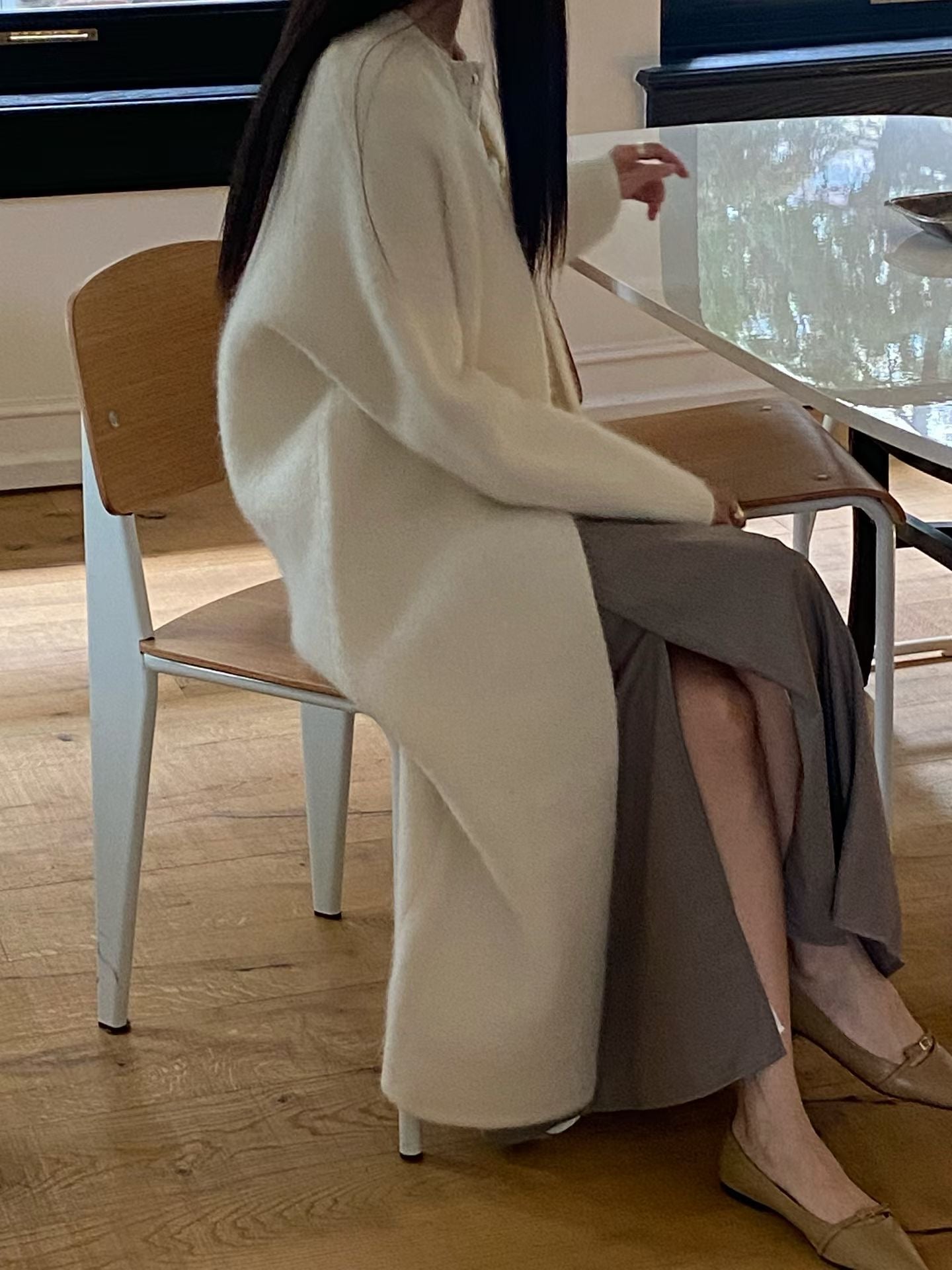 ⫸ 這款長版罩衫以極簡的「無鈕扣開襟設計」打造出柔和、自然垂墜的線條,呈現出溫柔慵懶的氣質。