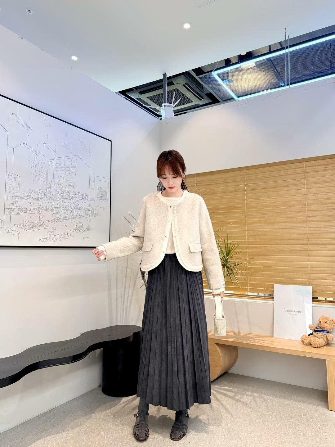 ⫸ 圓領+同色排扣:俐落不挑臉型,單穿或疊高領都優雅。