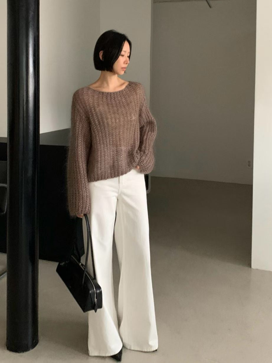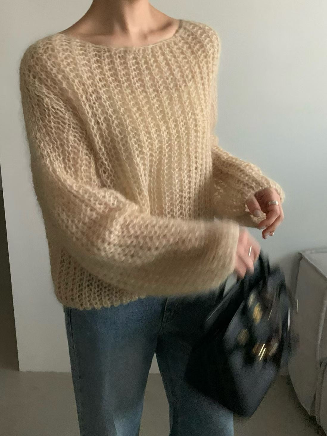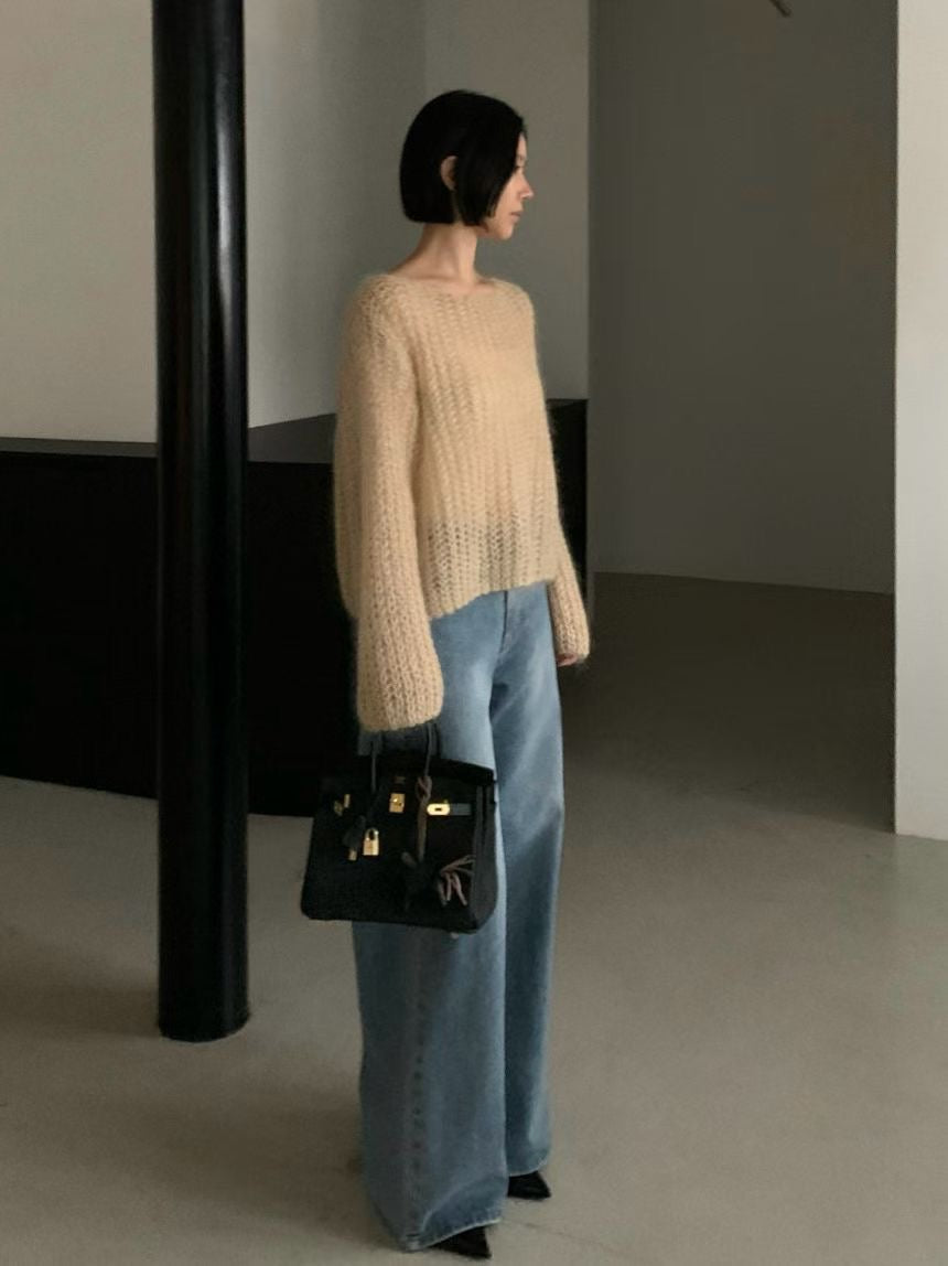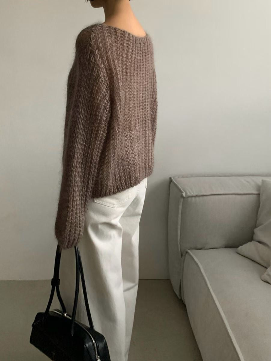 - 大面積空氣針織:採用略透的鬆織結構,讓毛海纖維自然蓬起,穿上就像一層輕柔雲霧覆在身上。