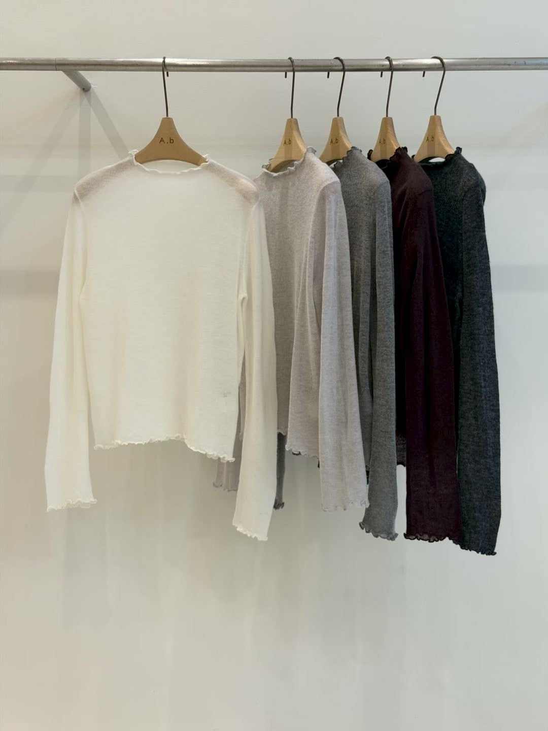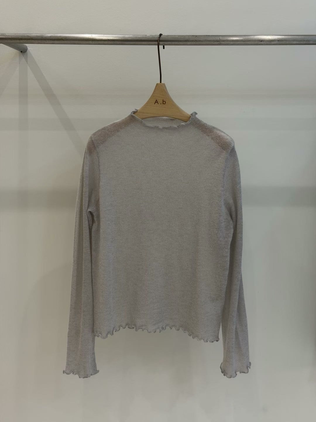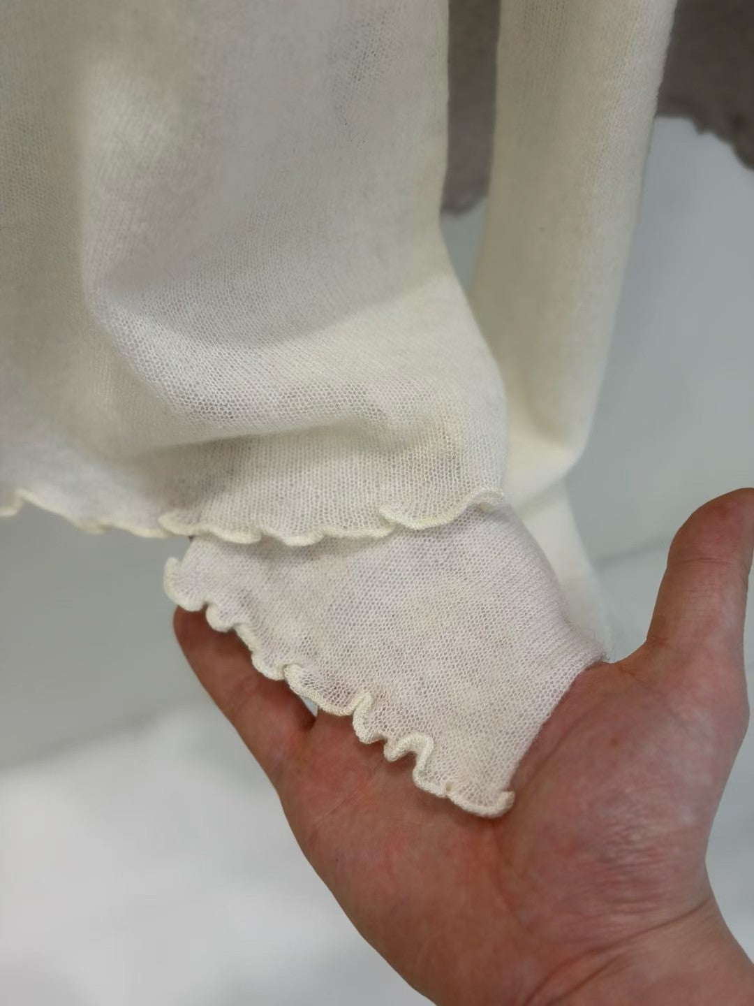 ⫸ 木耳邊細節:領口/袖口/下擺全採木耳捲邊,柔美不做作,露邊疊穿更有層次。