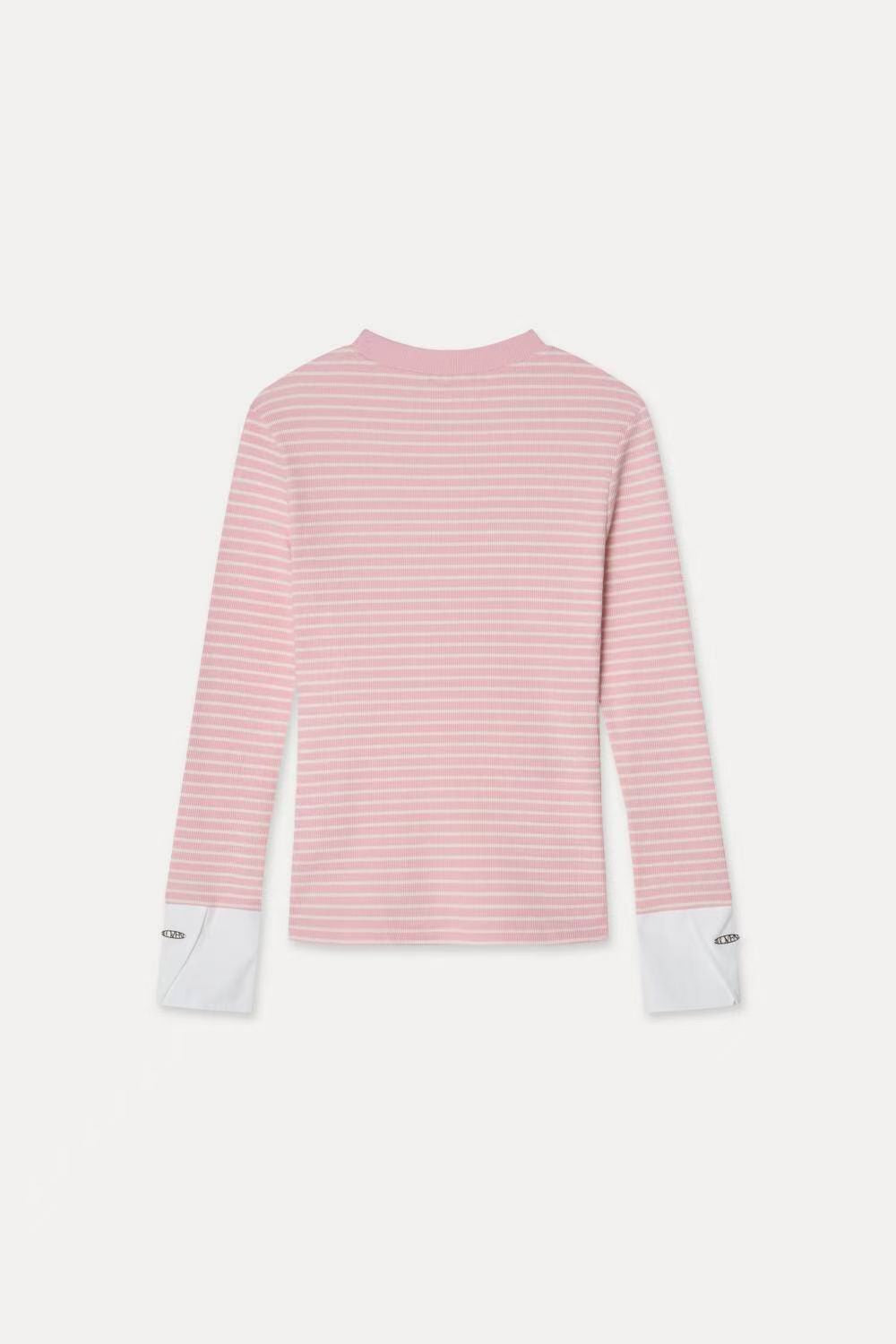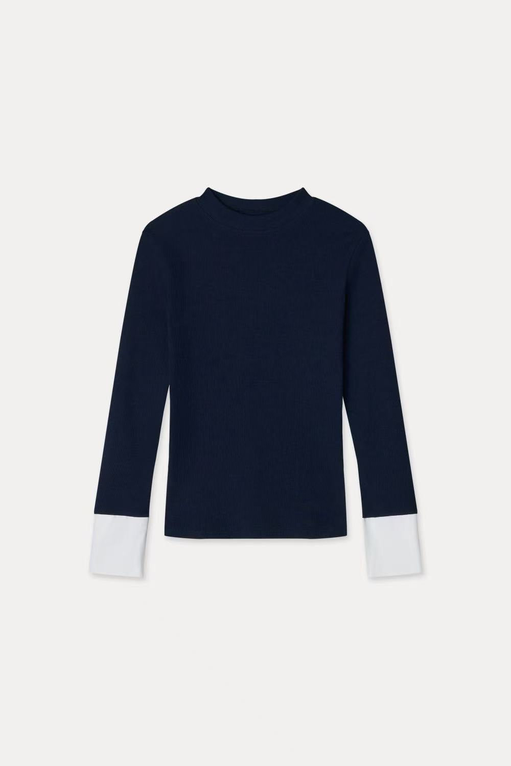 ⫸ 襯衫式「白袖口」拼接:長袖末端拼接乾淨俐落的白色襯衫布,視覺像把襯衫疊在針織裡,層次感直接滿分。