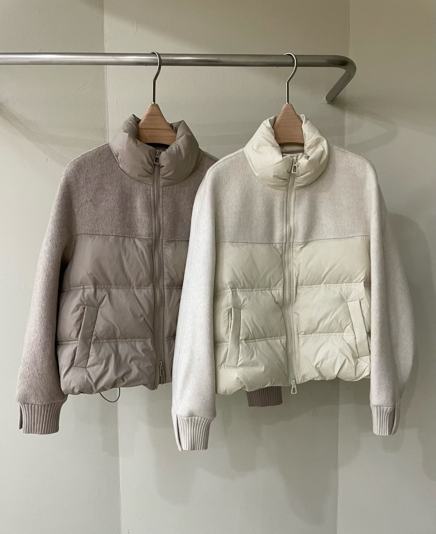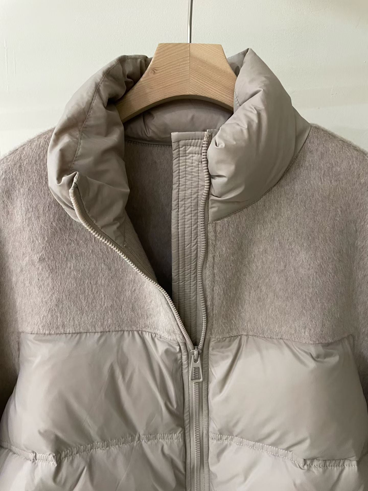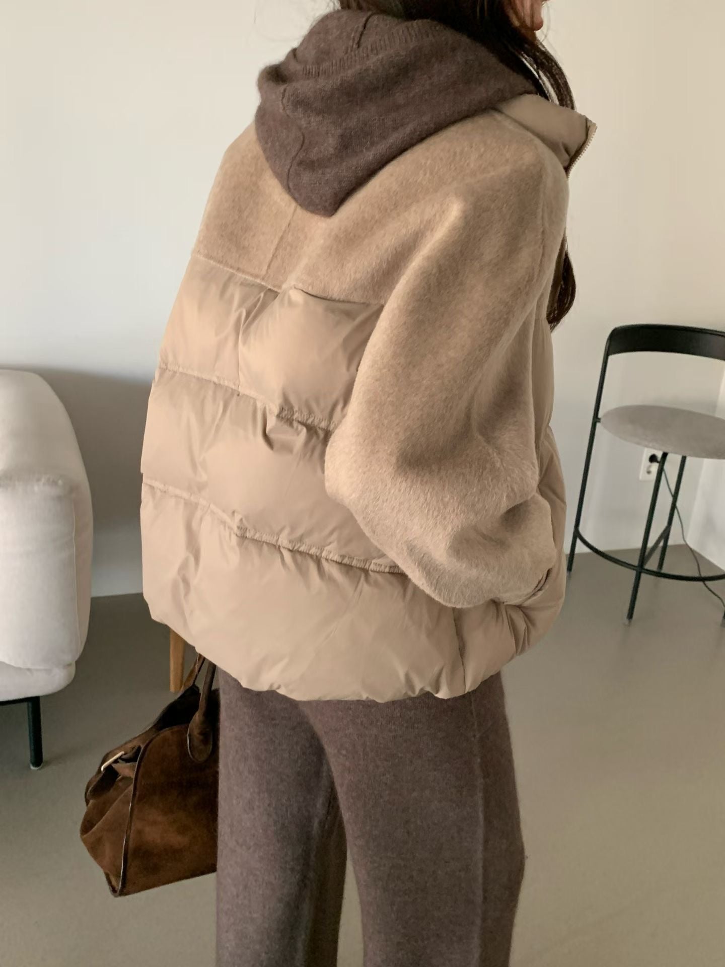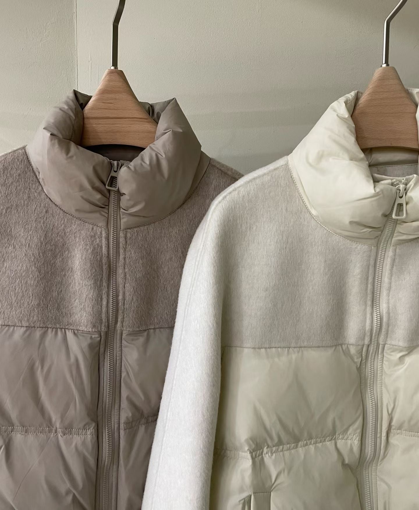 - 上半身與袖子使用帶毛絨感的軟呢布料,下半身與領口則是霧面質感的防風布料,加上超保暖的鴨絨,視覺上有明顯分割線,讓整件看起來立體、有層次。