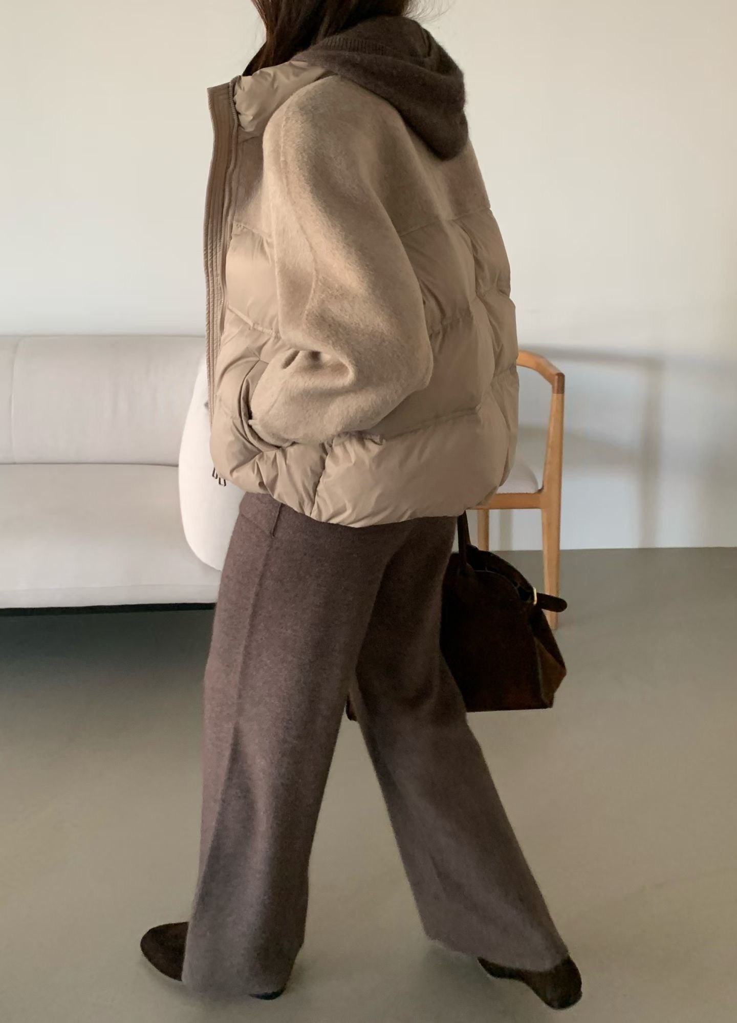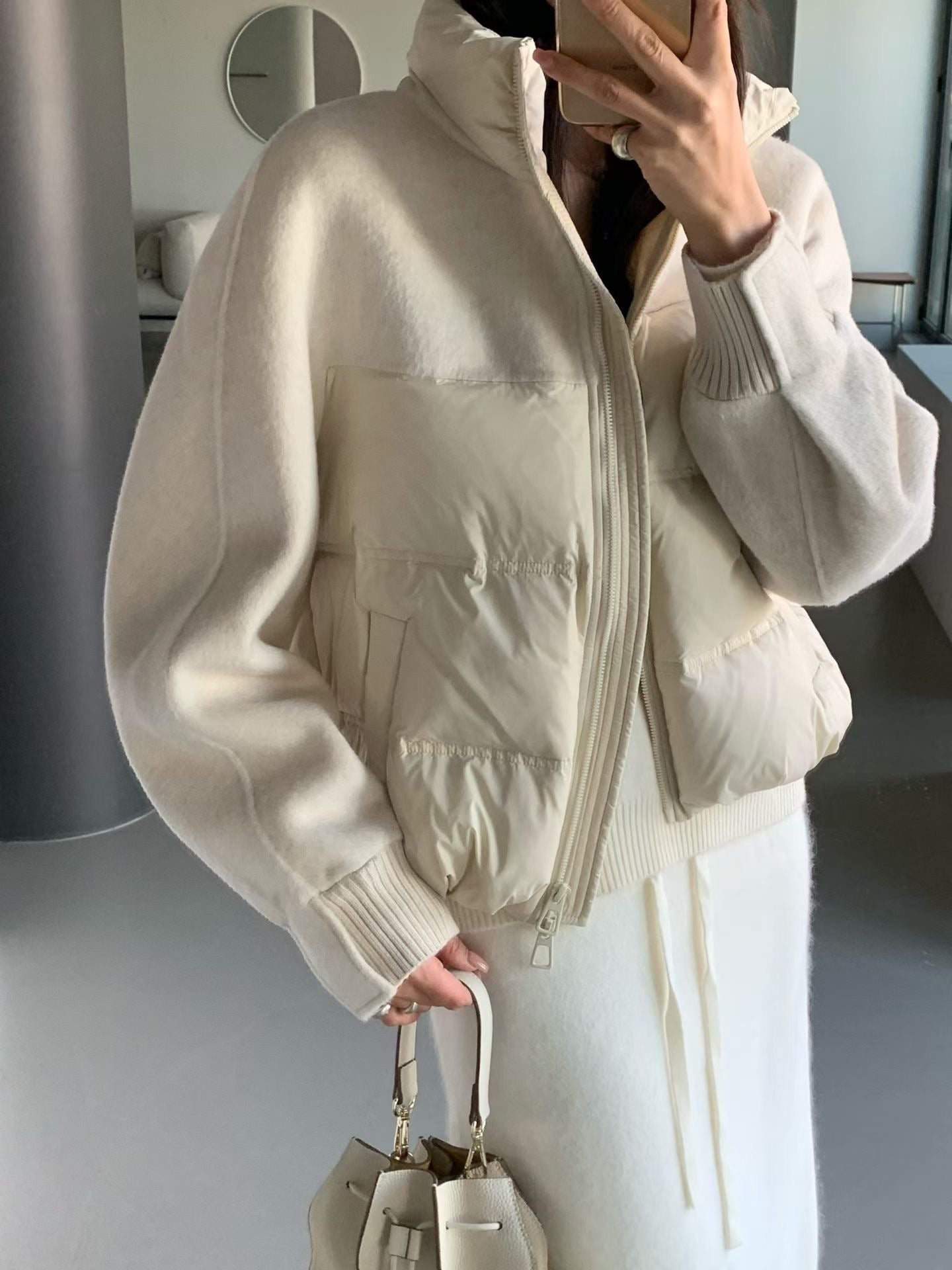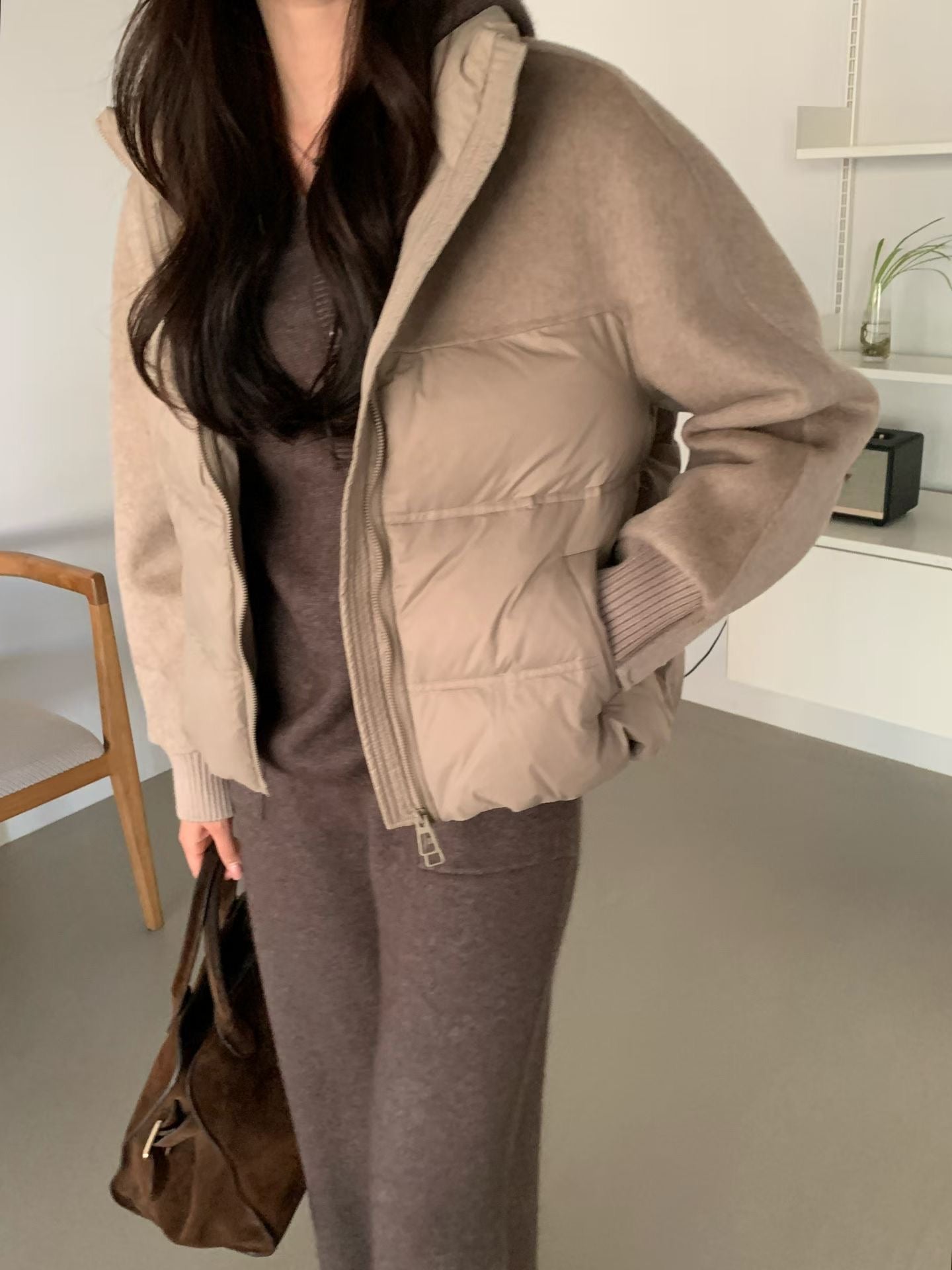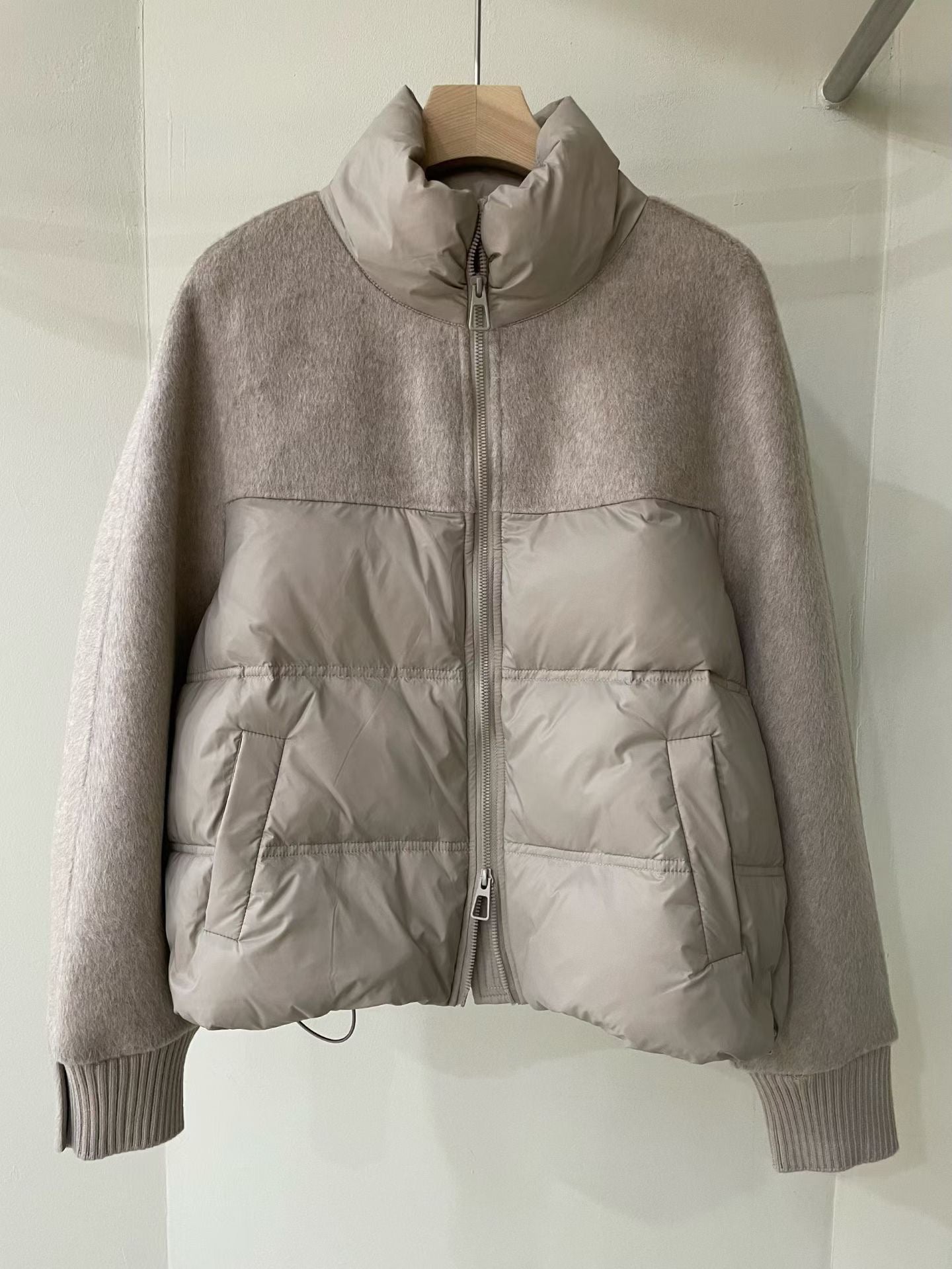 - 上半身與袖子使用帶毛絨感的軟呢布料,下半身與領口則是霧面質感的防風布料,加上超保暖的鴨絨,視覺上有明顯分割線,讓整件看起來立體、有層次。