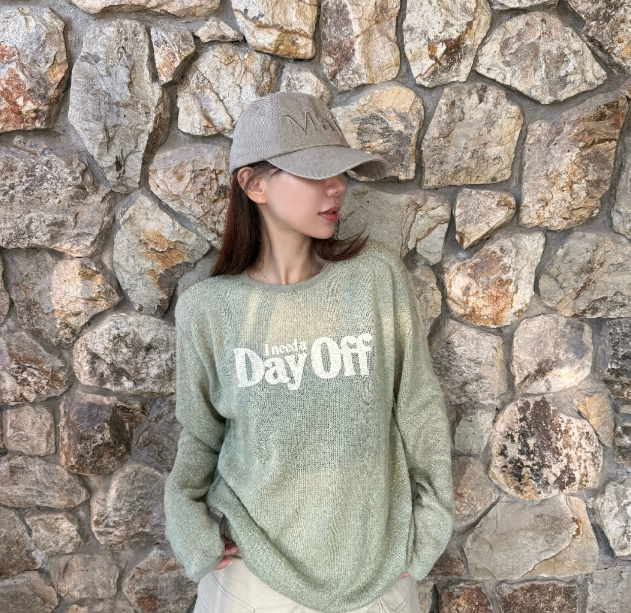 ⫸ 正面字樣「I need a Day Off」:做舊霧面質感,既俏皮又不浮誇,單穿就有焦點。