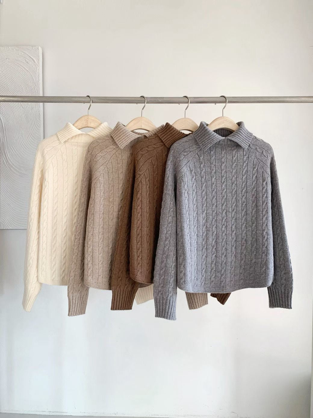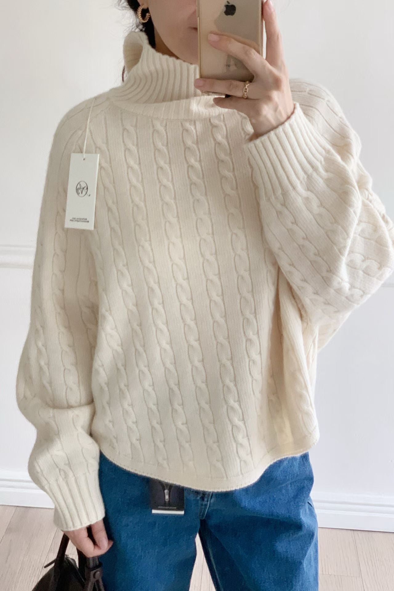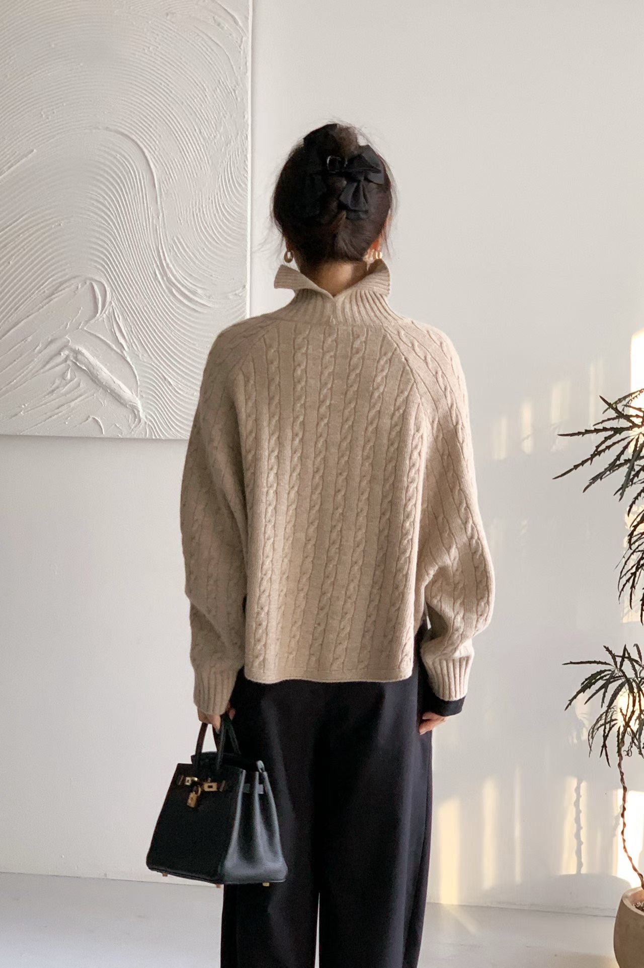- 這款高領毛衣以經典麻花編織結合繭型 Oversize 版型,穿上即呈現慵懶、高級的韓系風格。