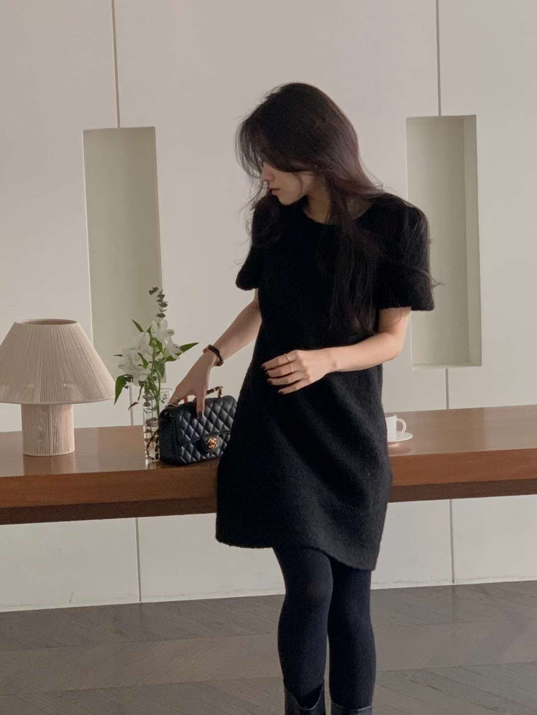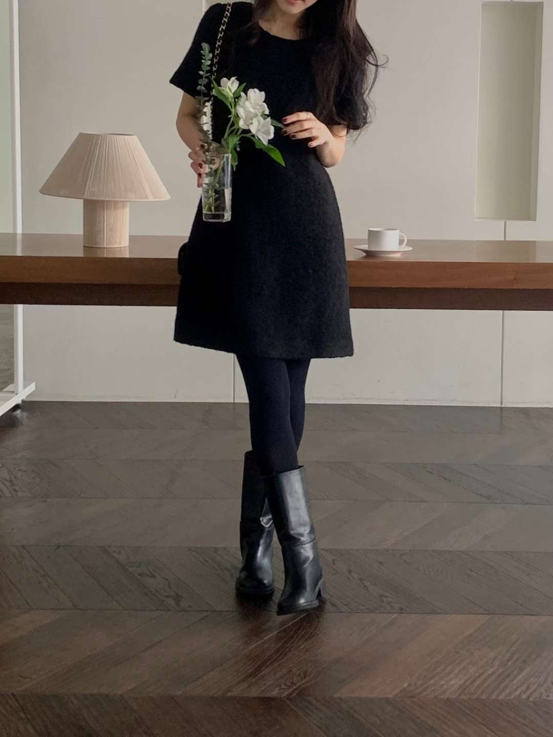 - 裙長約膝上:單穿不會過短,加上厚褲襪或長靴剛剛好,是秋冬最好駕馭的短洋裝長度。
