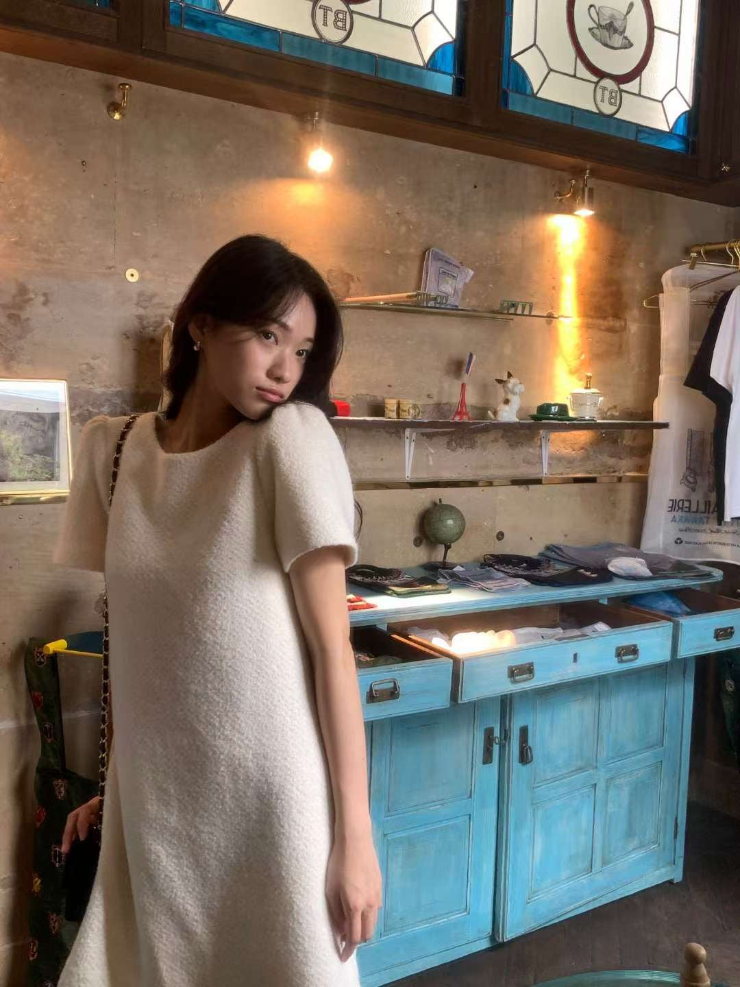 - 圓領+短袖設計:乾淨圓領搭配微蓬感短袖,露出鎖骨與手腕線條,修飾上半身又不會太甜膩。