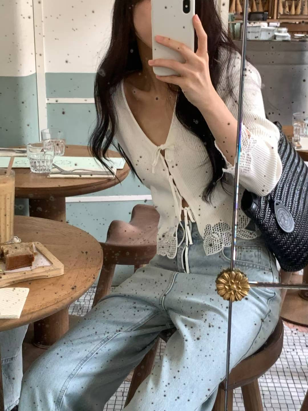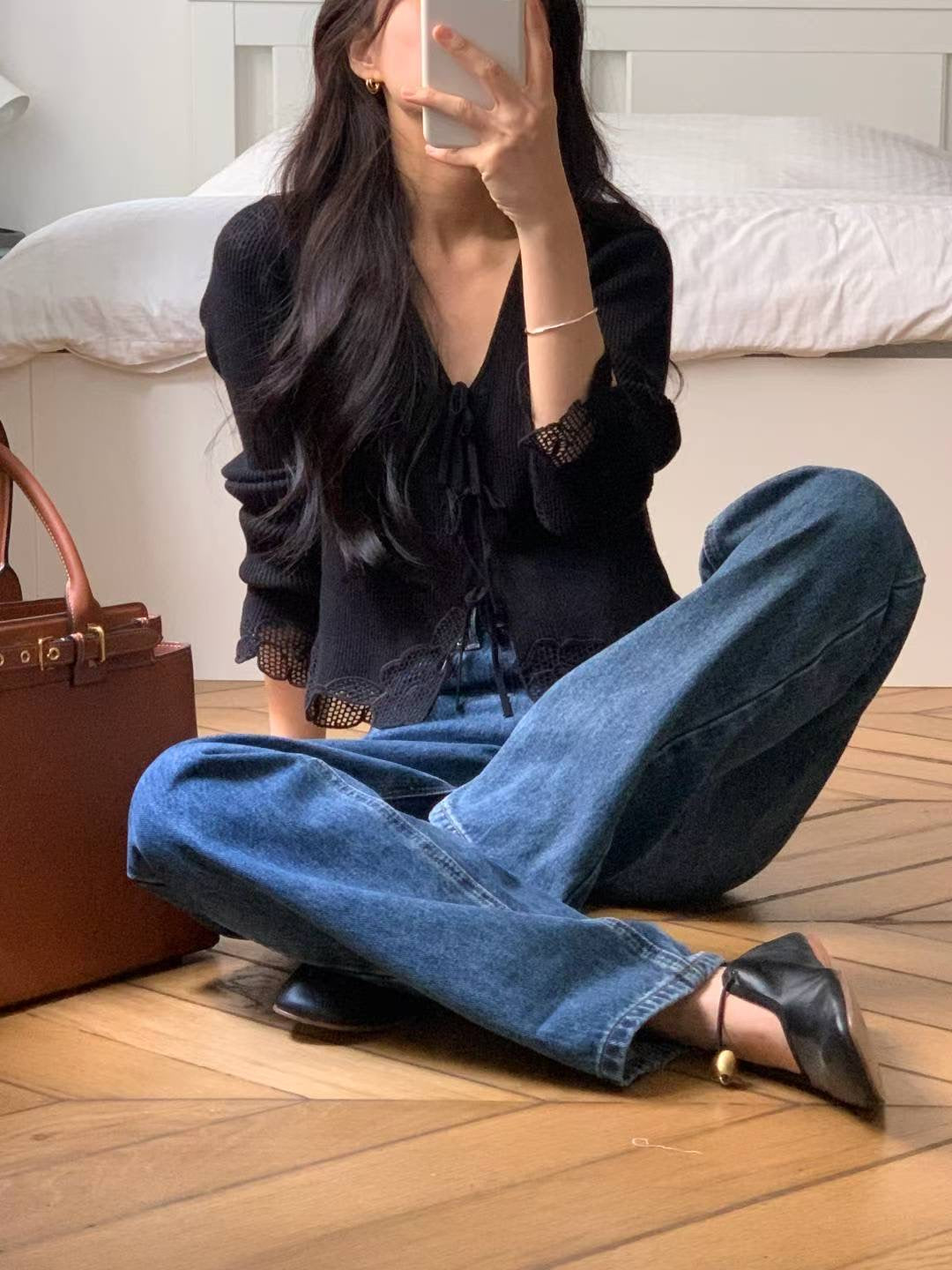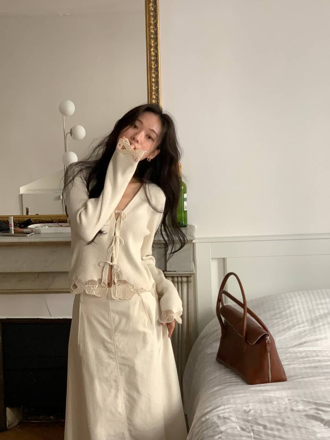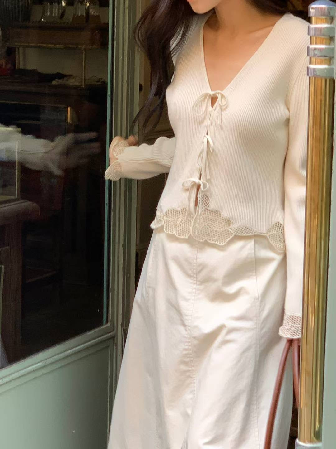 ⫸ 此款綁帶蕾絲針織上衣以優質素材與精緻細節展現法式浪漫,兼具實用與時尚,是秋冬衣櫥中不可錯過的亮點單品。