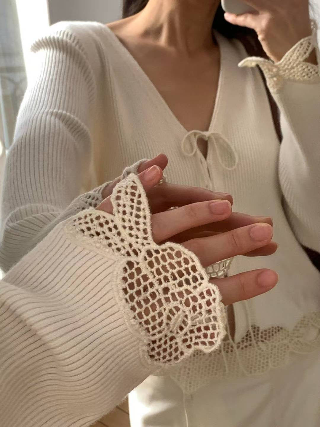 ⫸ 鏤空花邊:下擺與袖口採用高品質鉤針蕾絲拼接,精緻工藝帶來輕盈通透感,增添復古浪漫氣息。袖口的蕾絲延伸出指環形花邊,呈現仙氣十足。