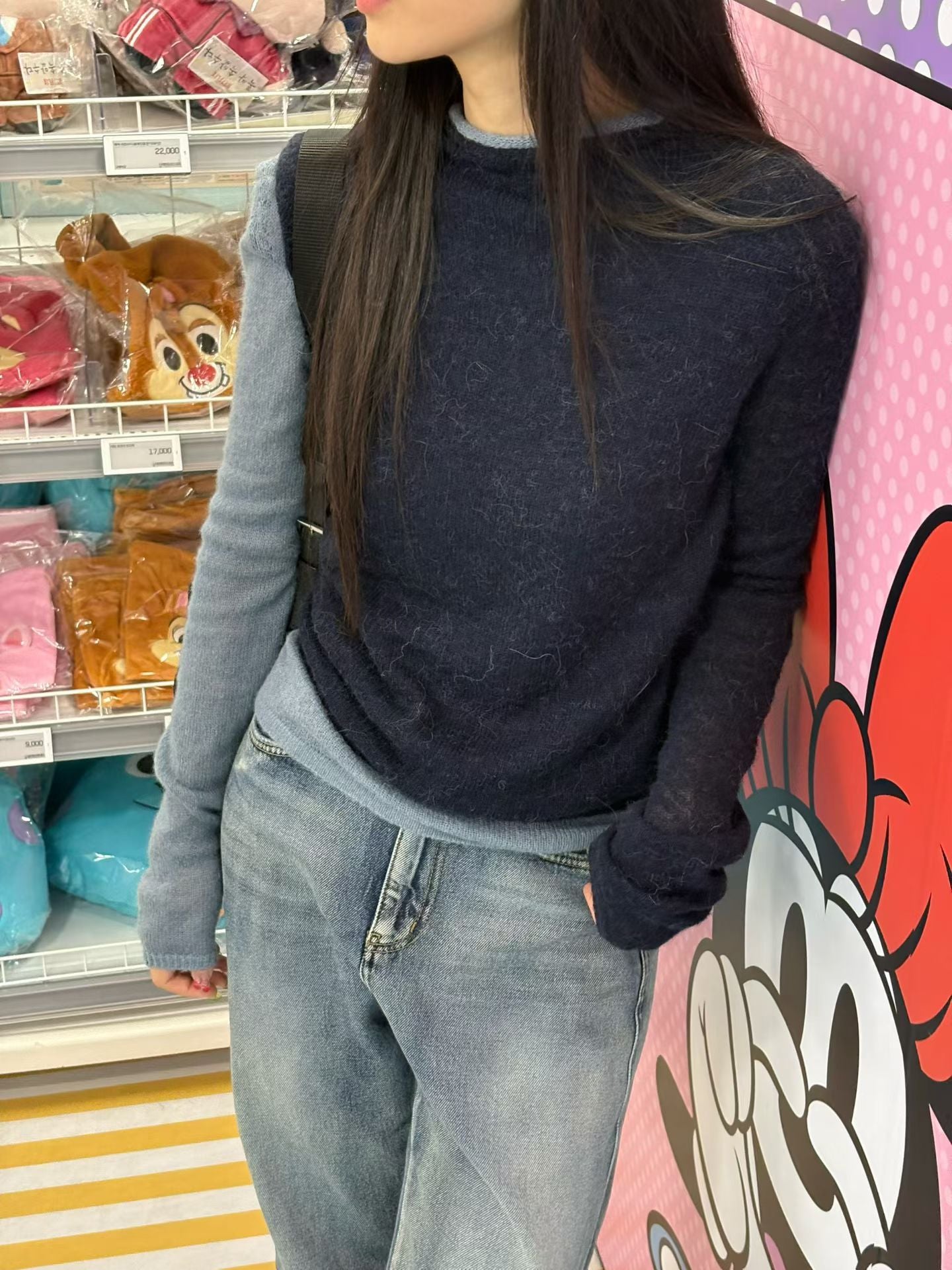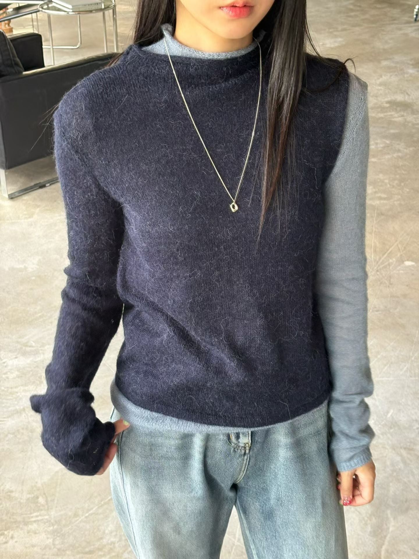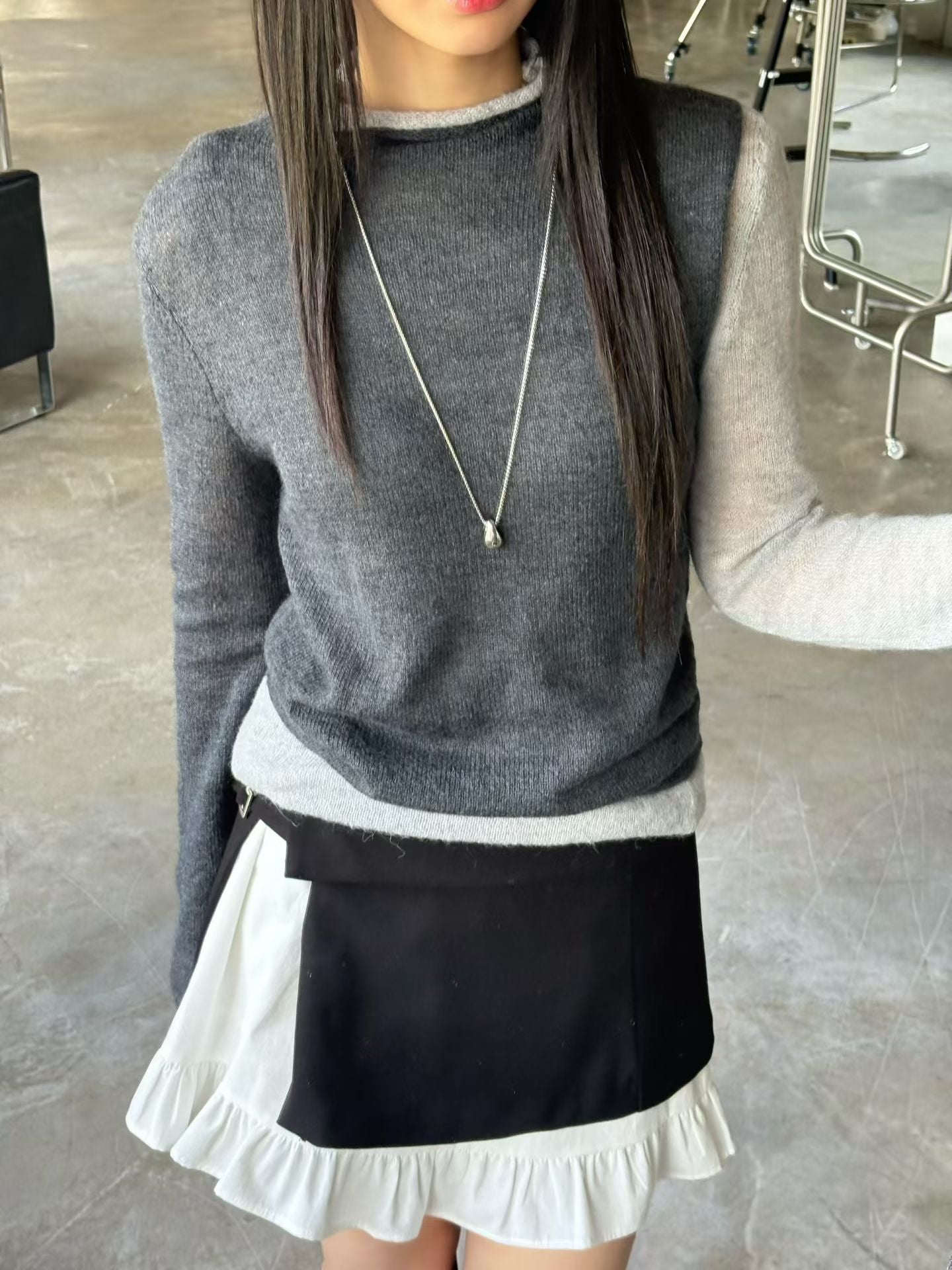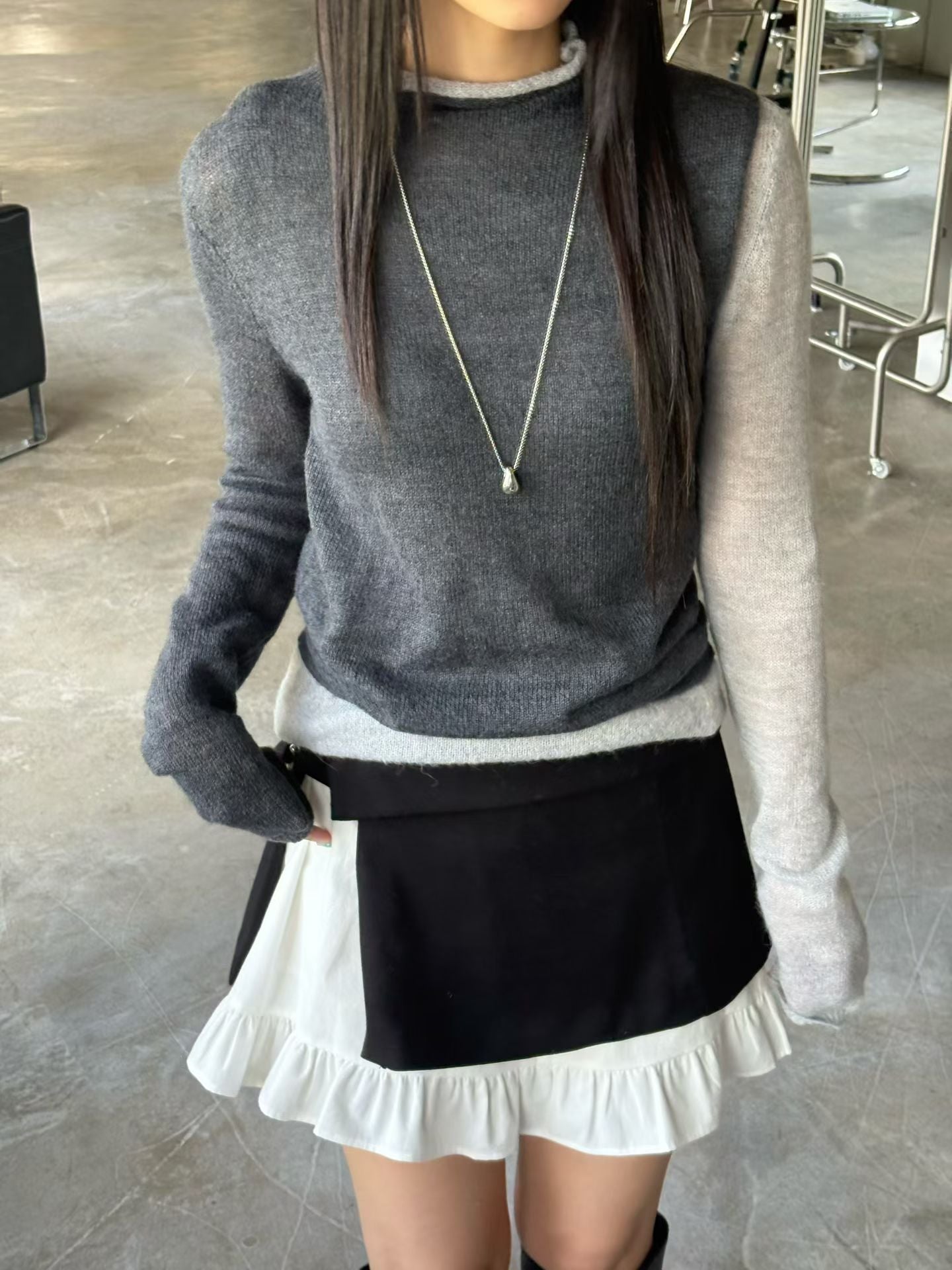 - 拼色袖設計(視覺超加分):左右袖使用不同色階毛料,營造“無造作但很時髦”的韓系風格,比一般素色毛衣更顯設計與層次感。