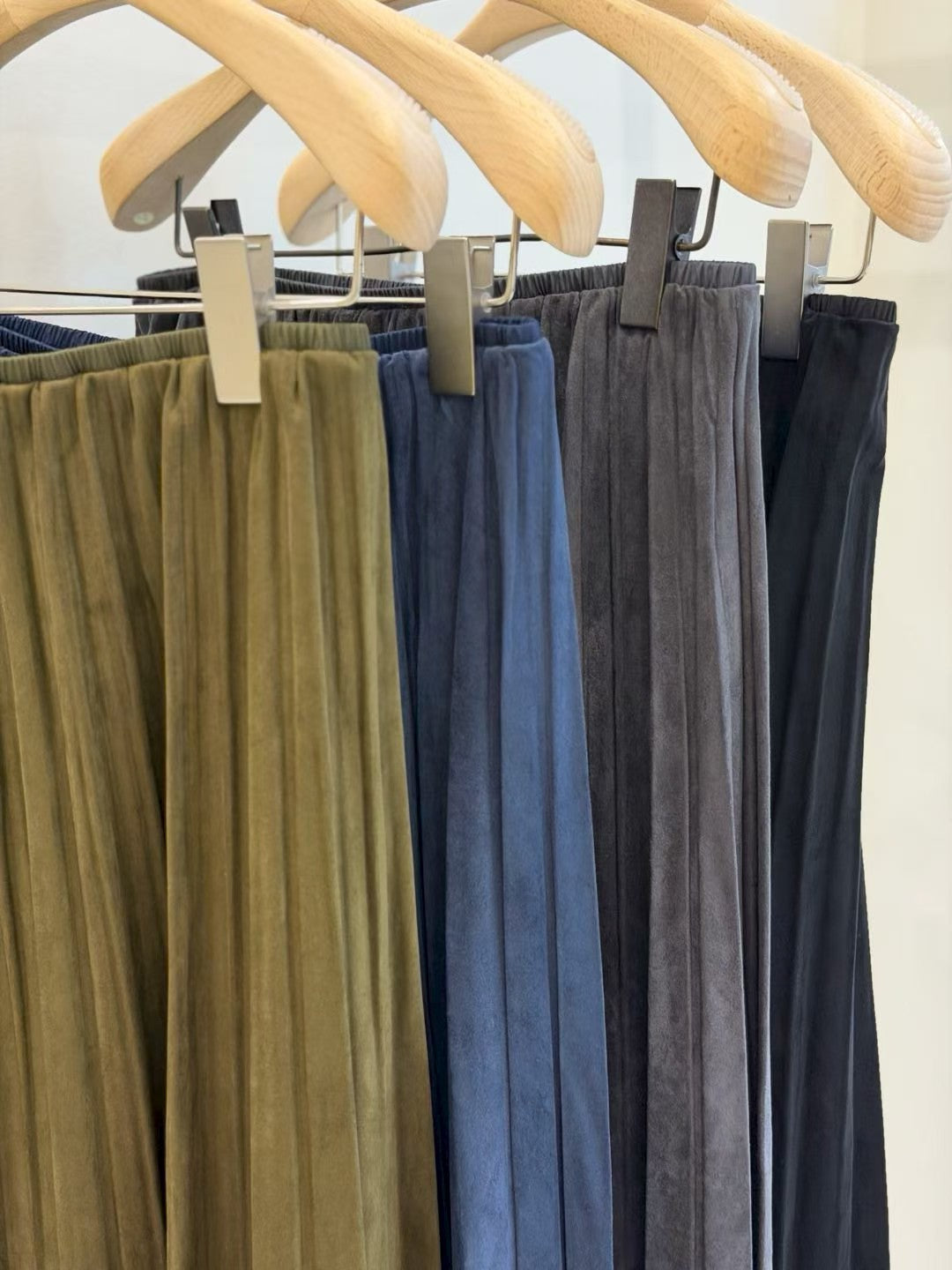 ⫸  中高腰定褶+霧面麂皮感,一穿就拉長比例、全身瞬間變精緻。
