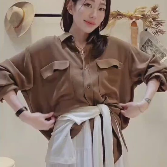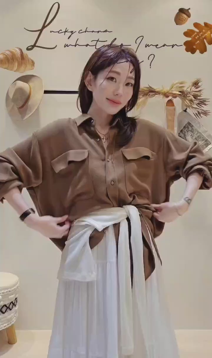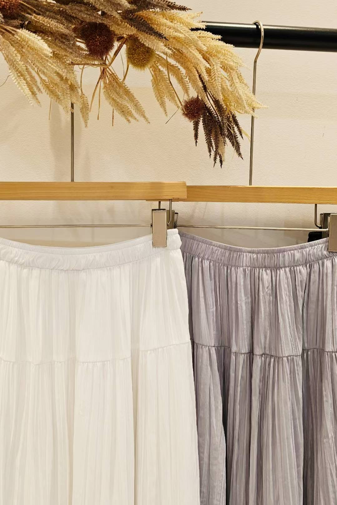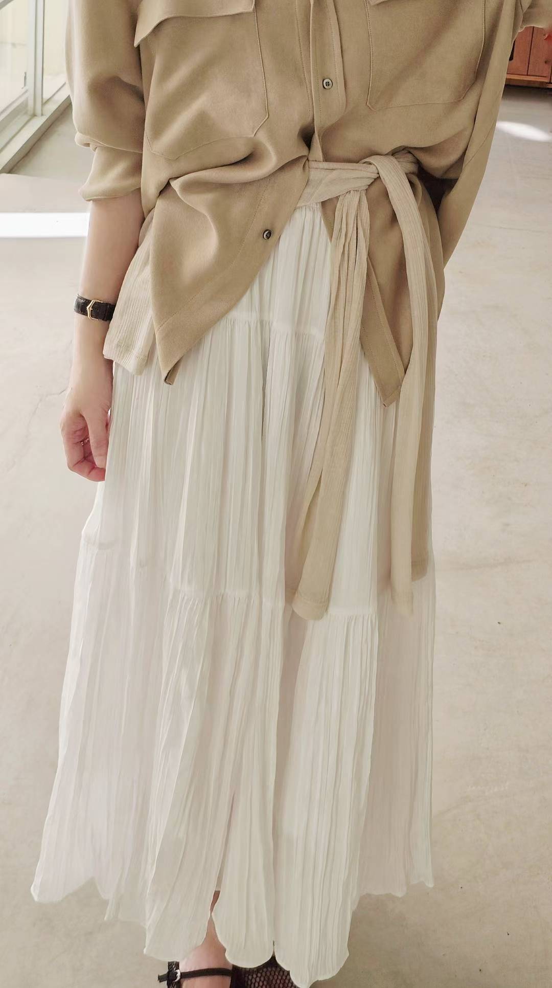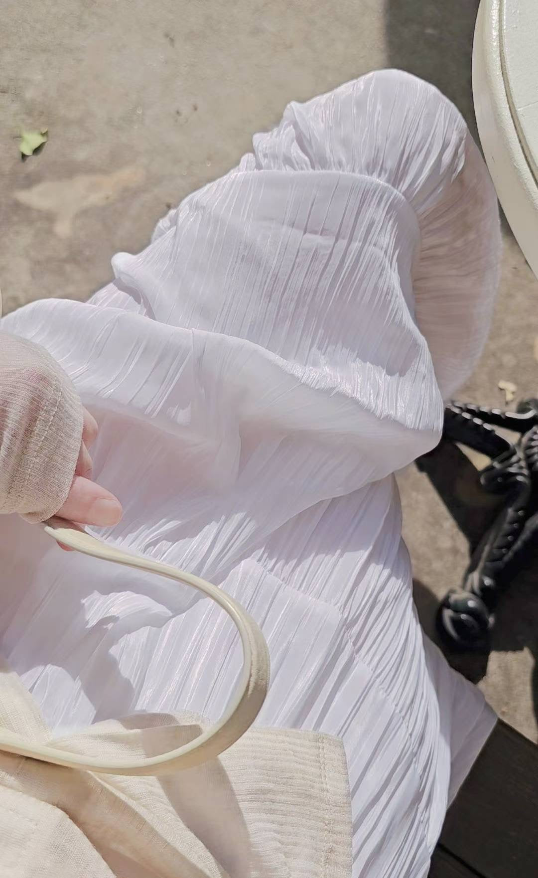 不規則皺皺面料,帶有微珠光,走動時候的光澤感很美~布料輕盈飄逸。