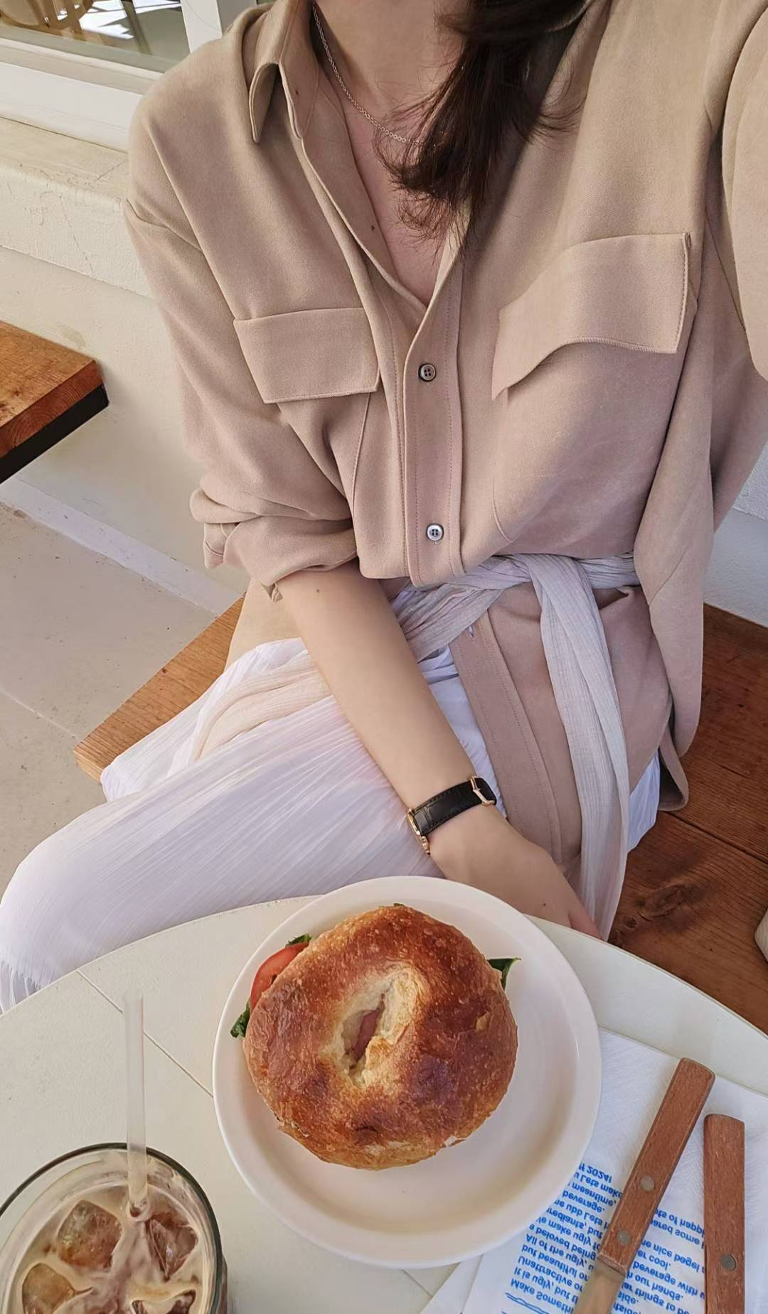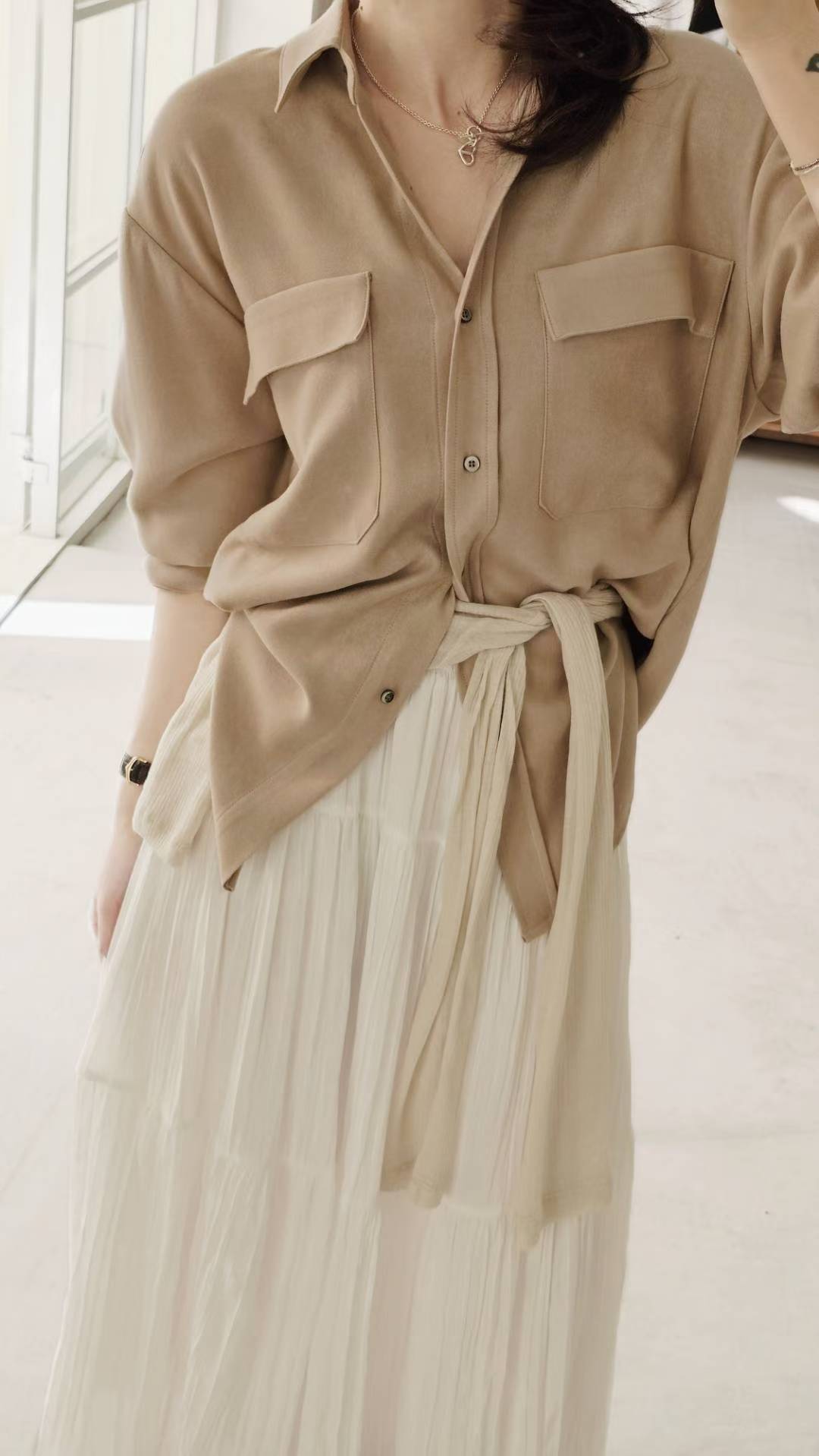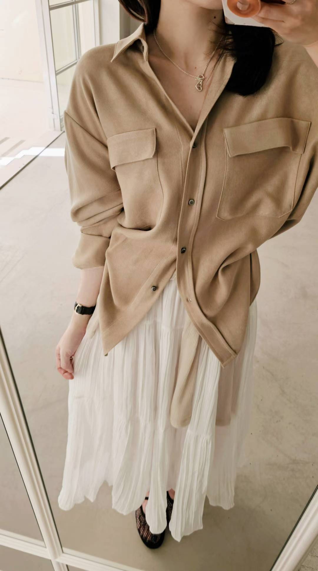 視覺上看起來像是仿麂皮,摸起來是柔軟的細緻絨面,單穿或是當外罩都合適,想嘗試這種風格也可以簡單消化的一款,兩個經典大地色系超美。