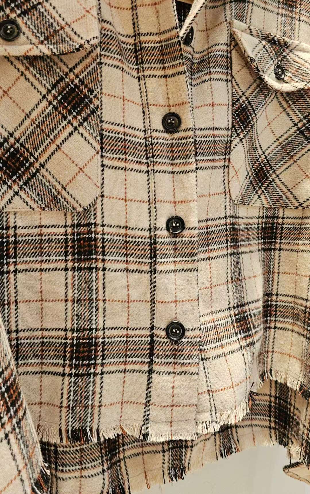 帶有厚度的格紋面料,比一般秋冬襯衫厚,仿毛料的材質,局部的纖維毛結是正常非不良。