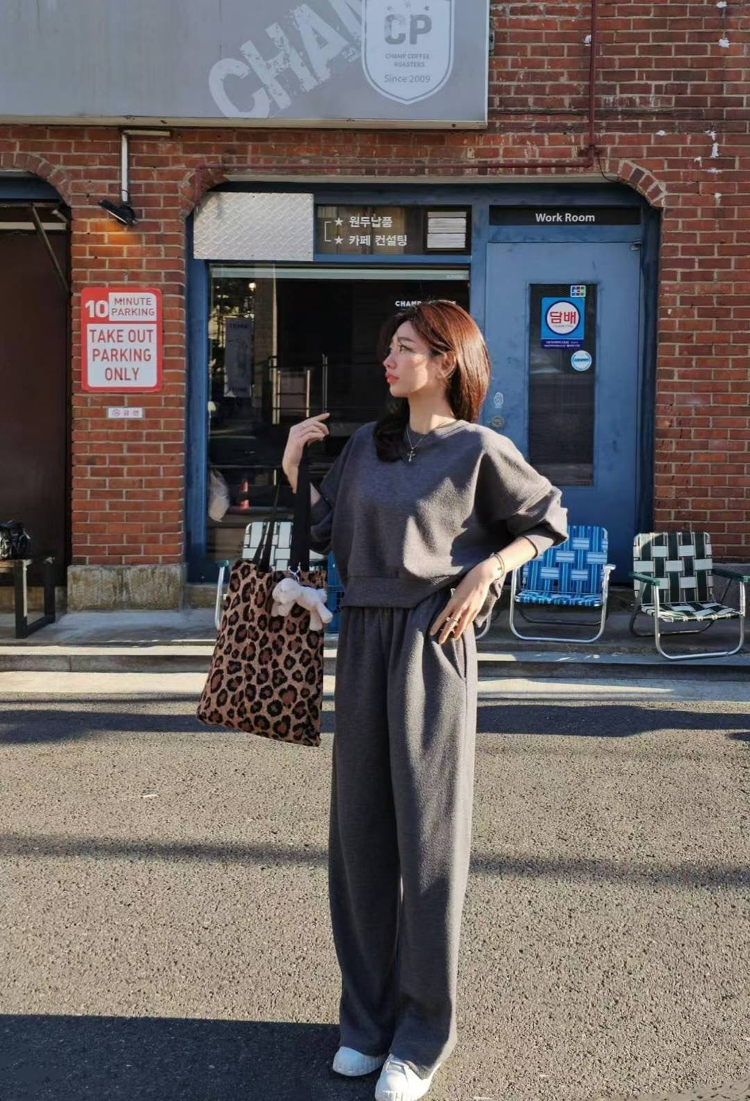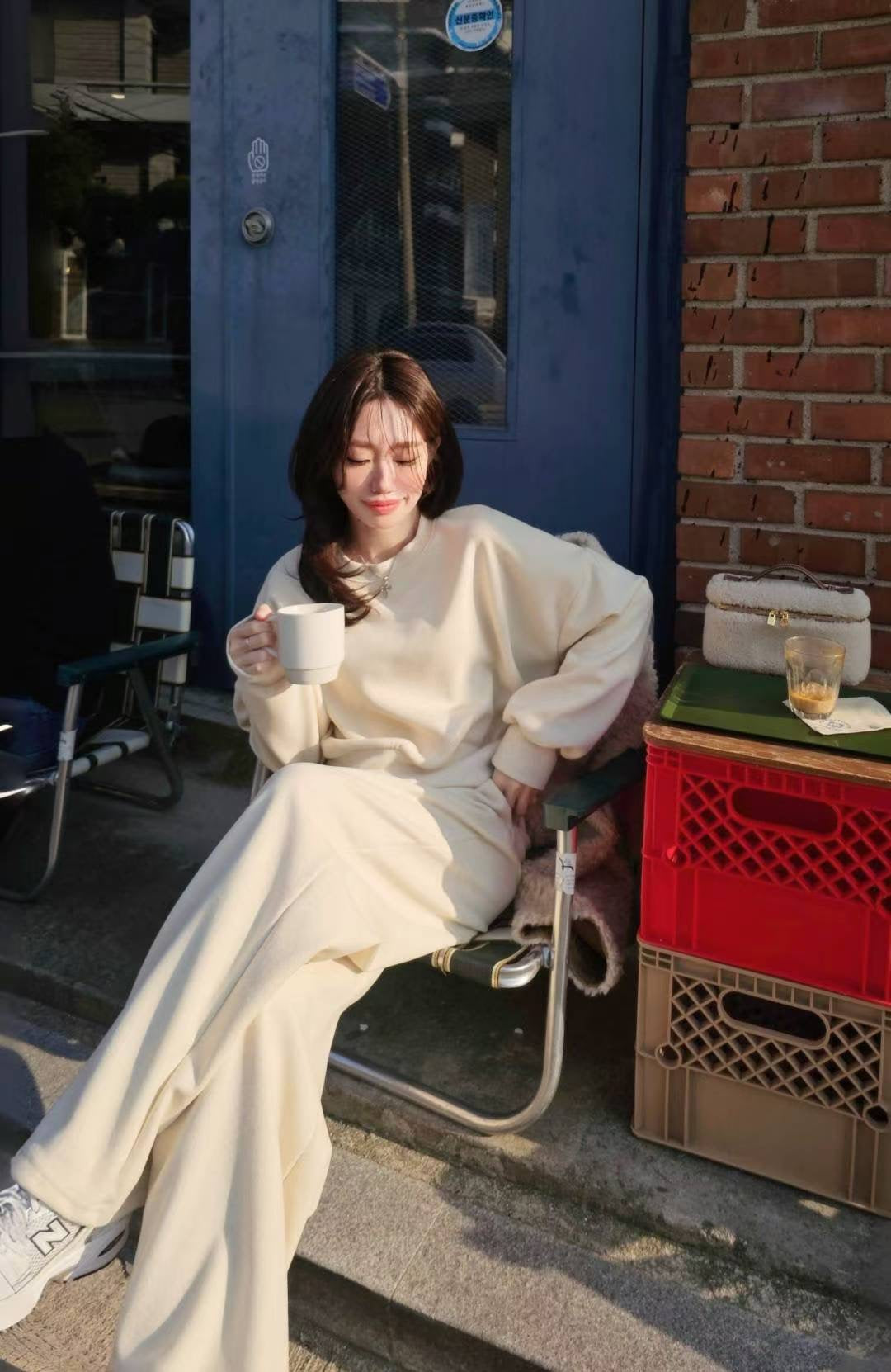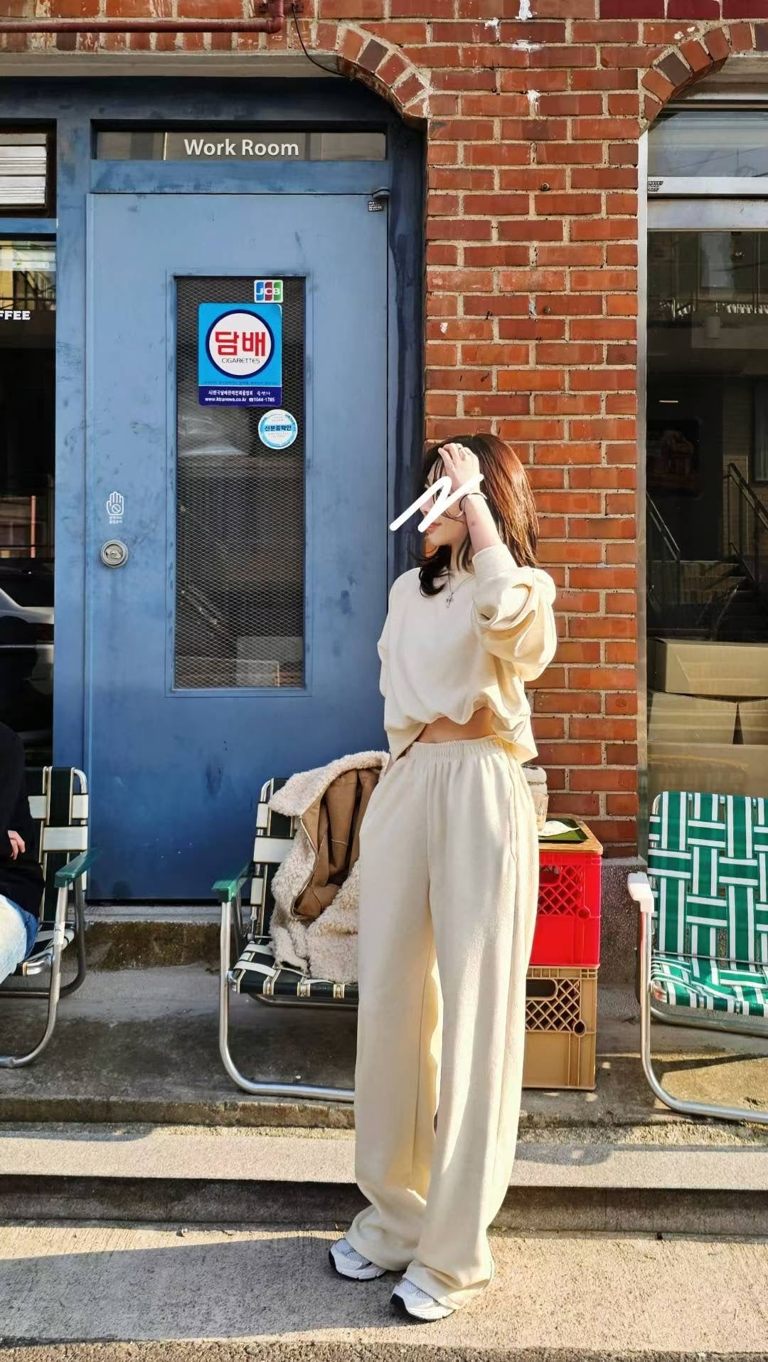 休閒鬆弛風格最愛的懶人衛衣套裝,上身是中等長度,剛好蓋住褲頭,不紮也好看~微寬的直筒長褲,修飾又大長腿,搭配其他秋冬針織毛衣一樣美美的。