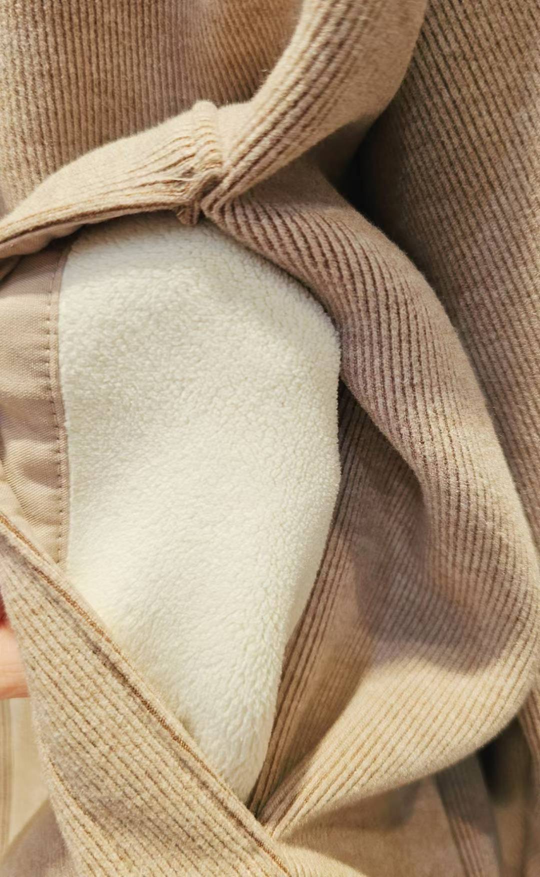 超細緻燈芯絨面料,整件內側都有做珊瑚絨加工,身體和袖子部分有內裡所以看不見,但是整件都是有非常保暖的內層珊瑚絨(可以參考口袋內側),雙向霧面質感品牌拉鍊~